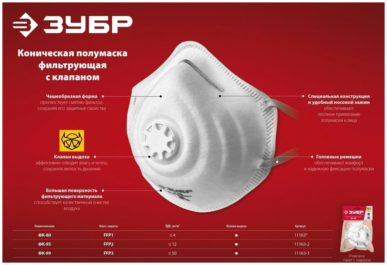 Коническая фильтрующая полумаска ЗУБР ФК-95, класс защиты FFP2, с клапаном выдоха интересное: