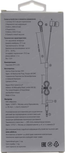 Наушники Oklick HP-S-220, 3.5 мм, вкладыши, черный [d2-1b]