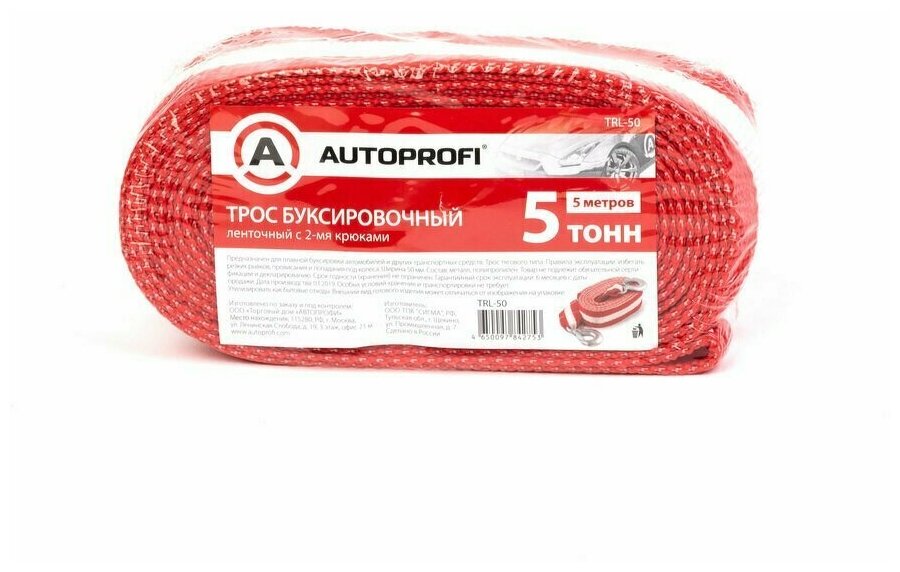 Трос буксировочный лента, AUTOPROFI, 5 тонн, с 2-мя крюками, термоупаковка, длин TRL50 1шт