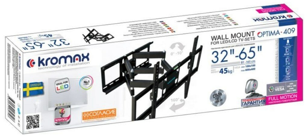 Кронштейны для техники Kromax Кронштейн настенный Kromax OPTIMA-409 32-65" (наклон 0°/+10°, поворот 160°, до 45 кг, черный)