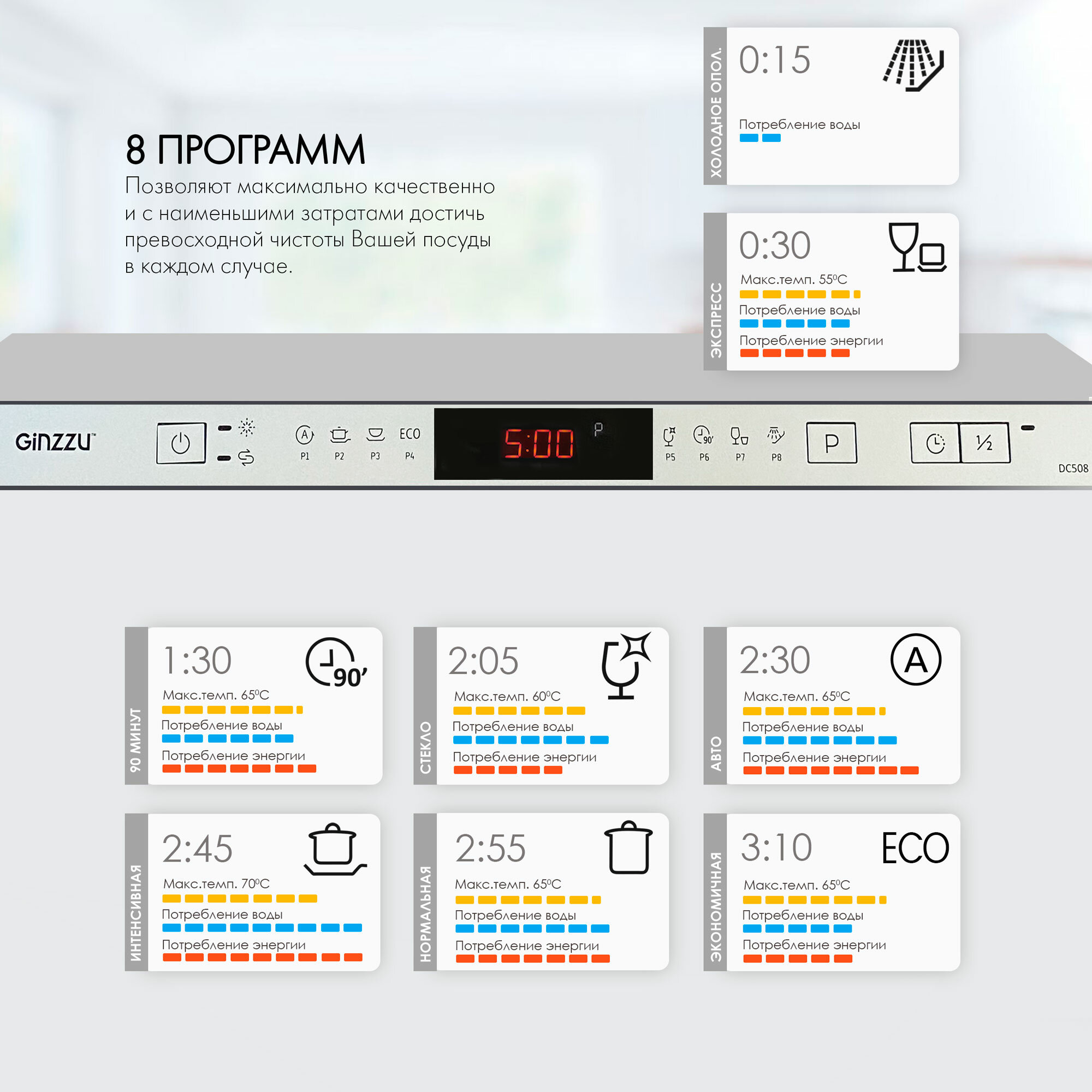 Встраиваемая посудомоечная машина Ginzzu DC508, 10 комплектов, конденсационная сушка, A++
