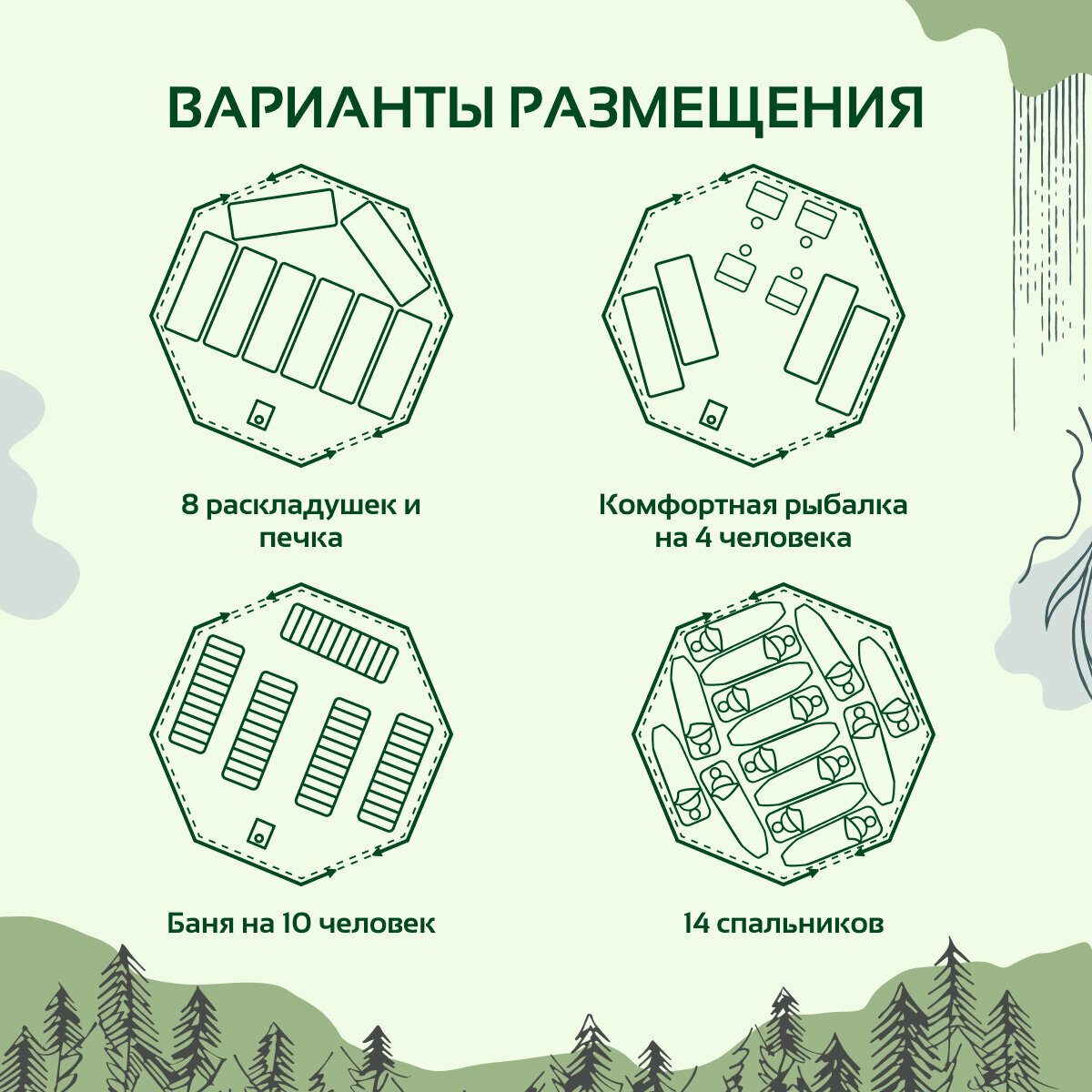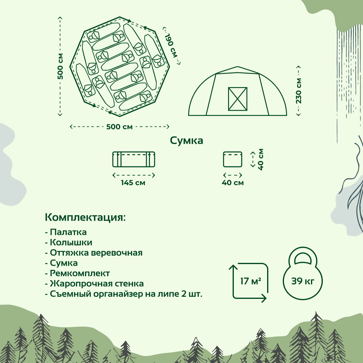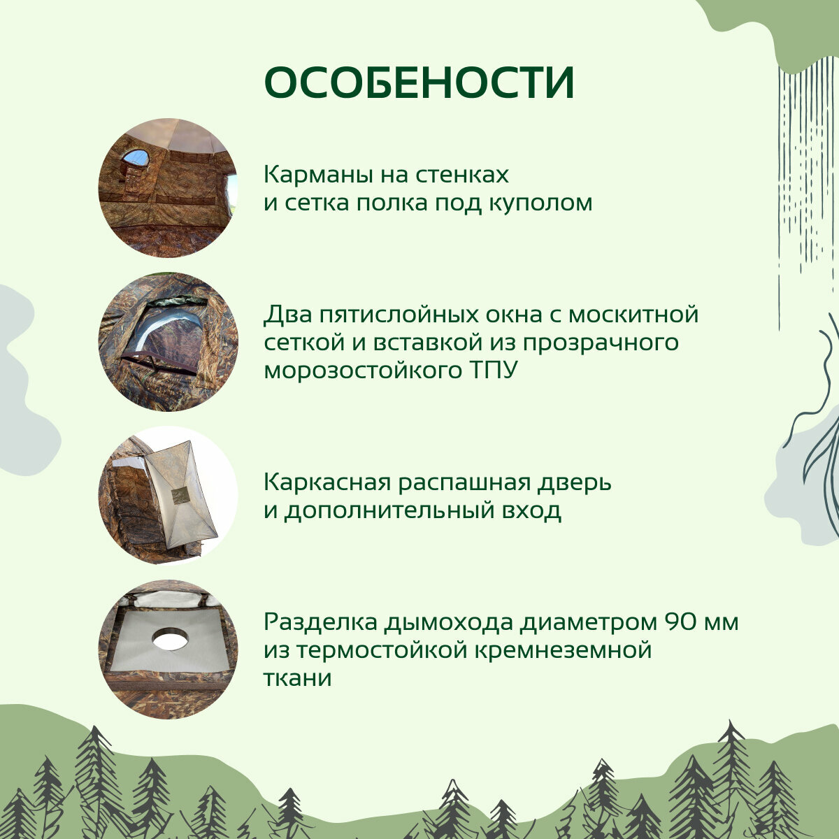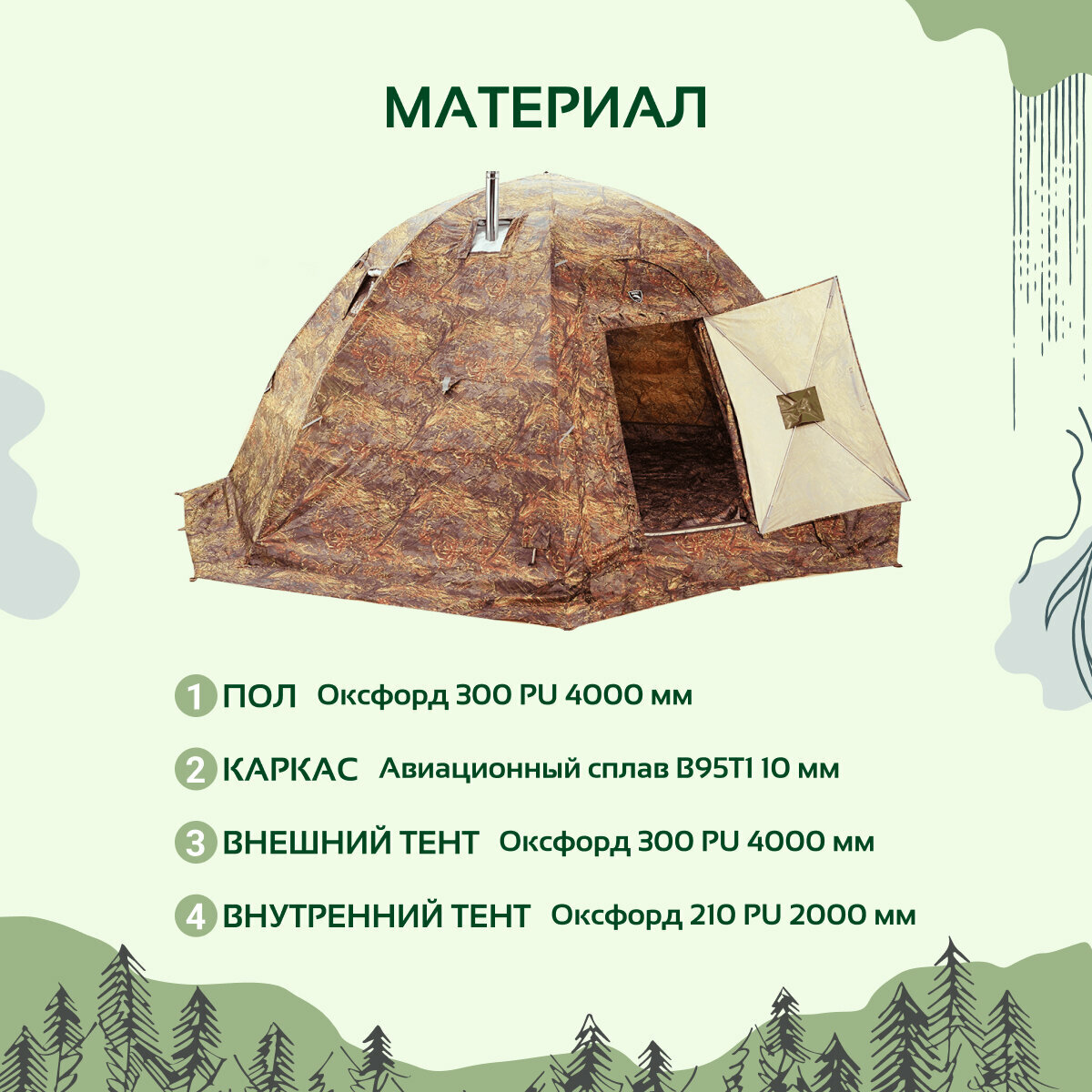 | Дополнительная информация | разделка дымохоесть, стенка палатки оснащена съемной тремотканью на липе |