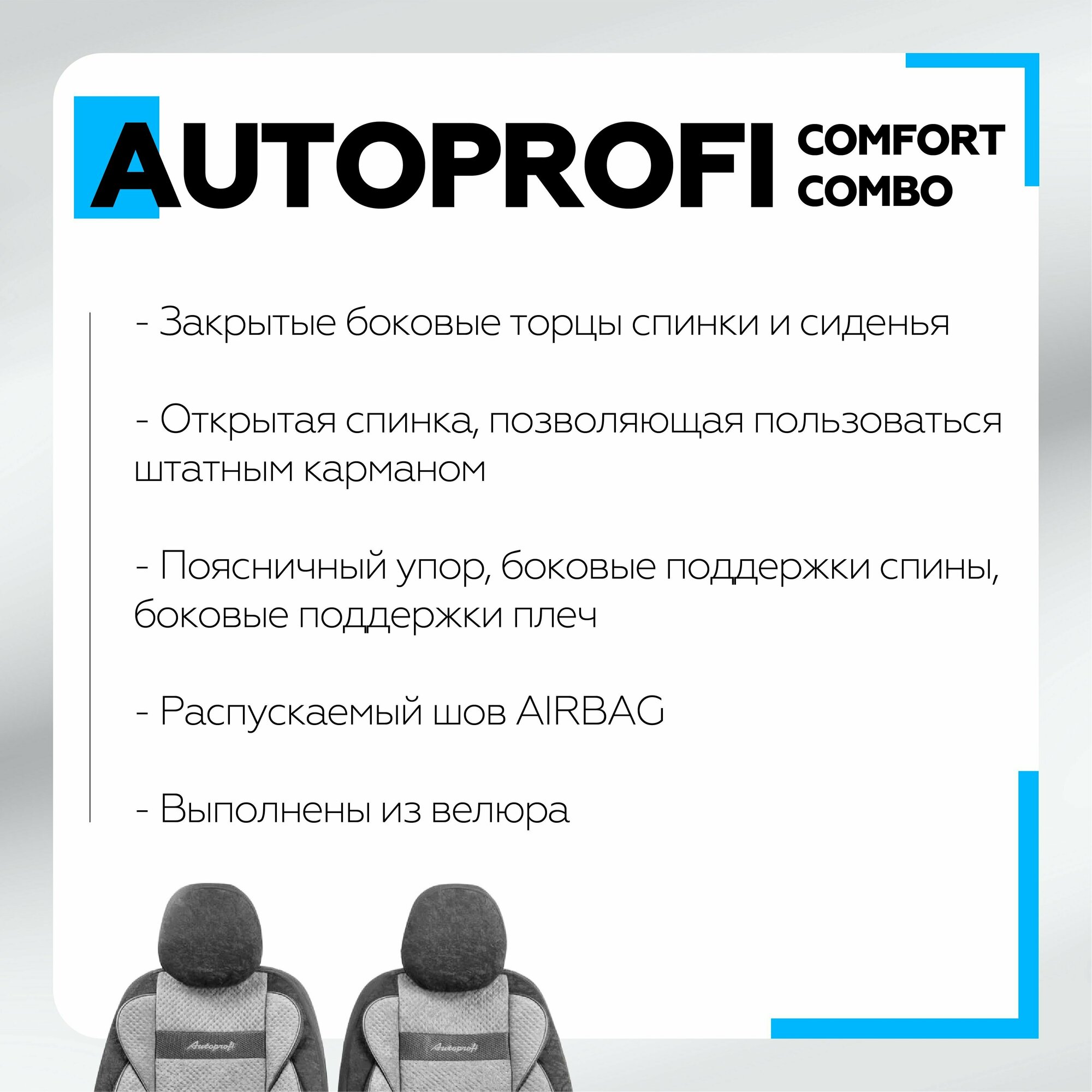 Получехлы на передние сиденья AUTOPROFI CMB-0405 BK/BL COMFORT COMBO, велюр, 5 мм поролон, 3D крой, поясничный упор, 4 пред., чёрный/синий