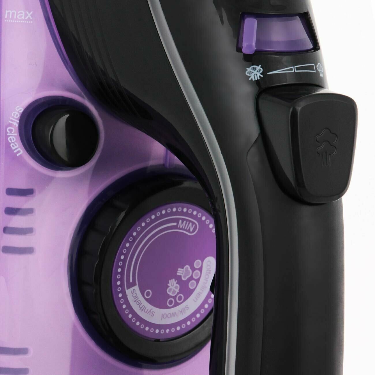 | Плюсы: | Длинный шнур, красивое сочетание фиолетового и черного цвета, есть подсветка, легко скользит, не копится накипь в отверстия подошвы |
