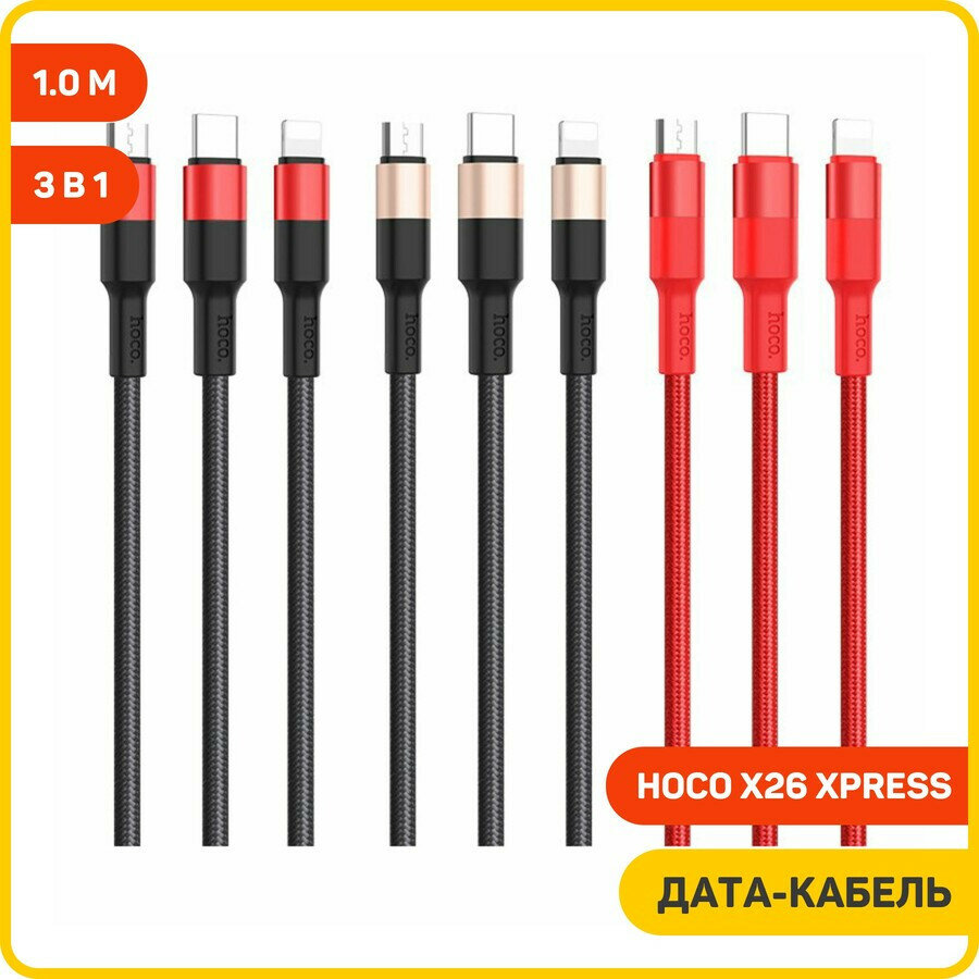 Купить Дата-кабель Hoco X26 Xpress (3 в 1) USB-MicroUSB/Lightning/Type-C, 1 м, черный с красным