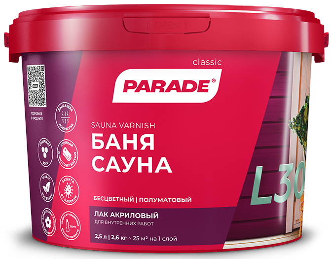 Лак для саун акриловый Classic L30 Сауна & Баня Parade 2,5 л бесцветный полуматовая