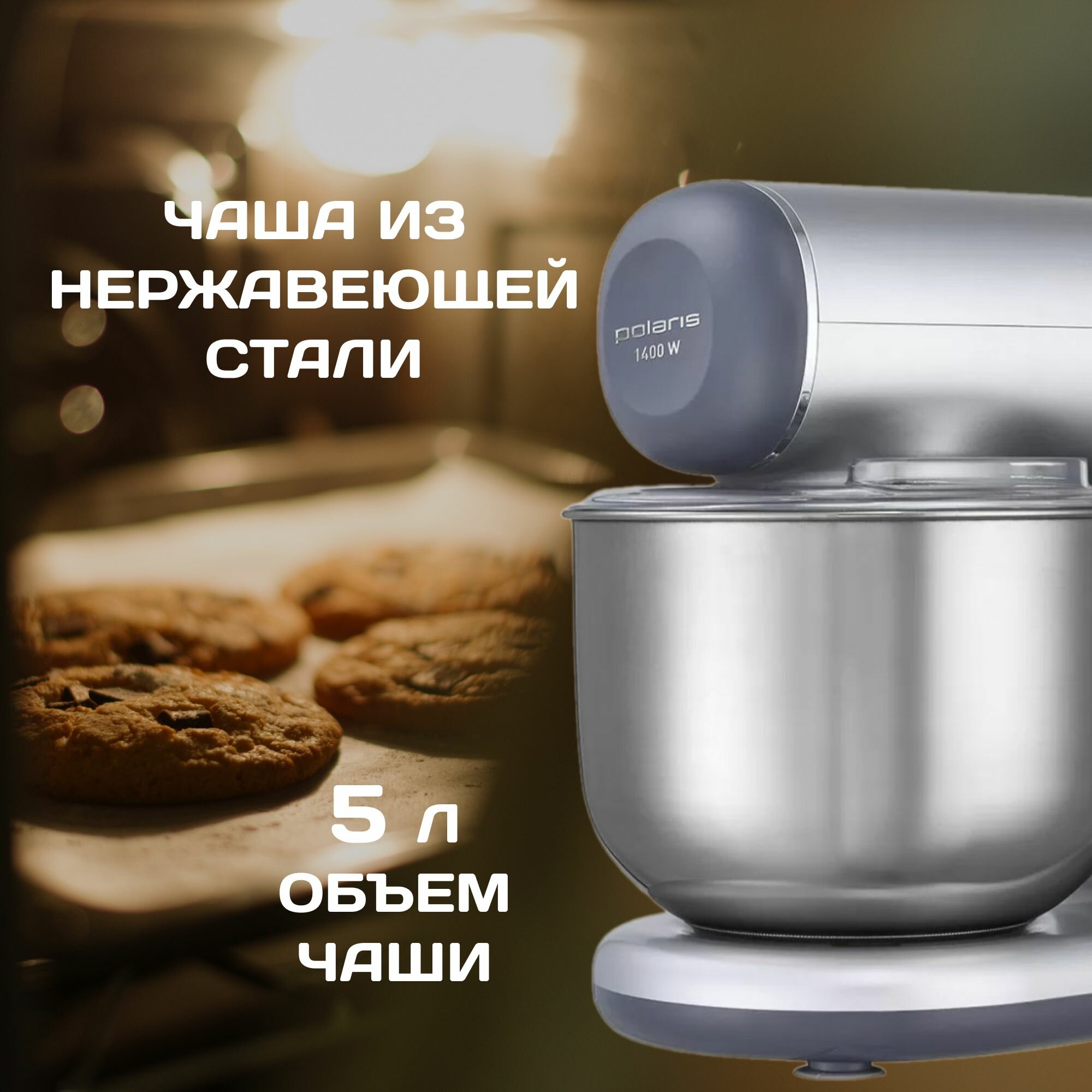 Кухонная машина Polaris PKM 1403, 1400 Вт, 6 скоростей, импульсный режим, планетарное смешивание, чаша 5 л, серебристый