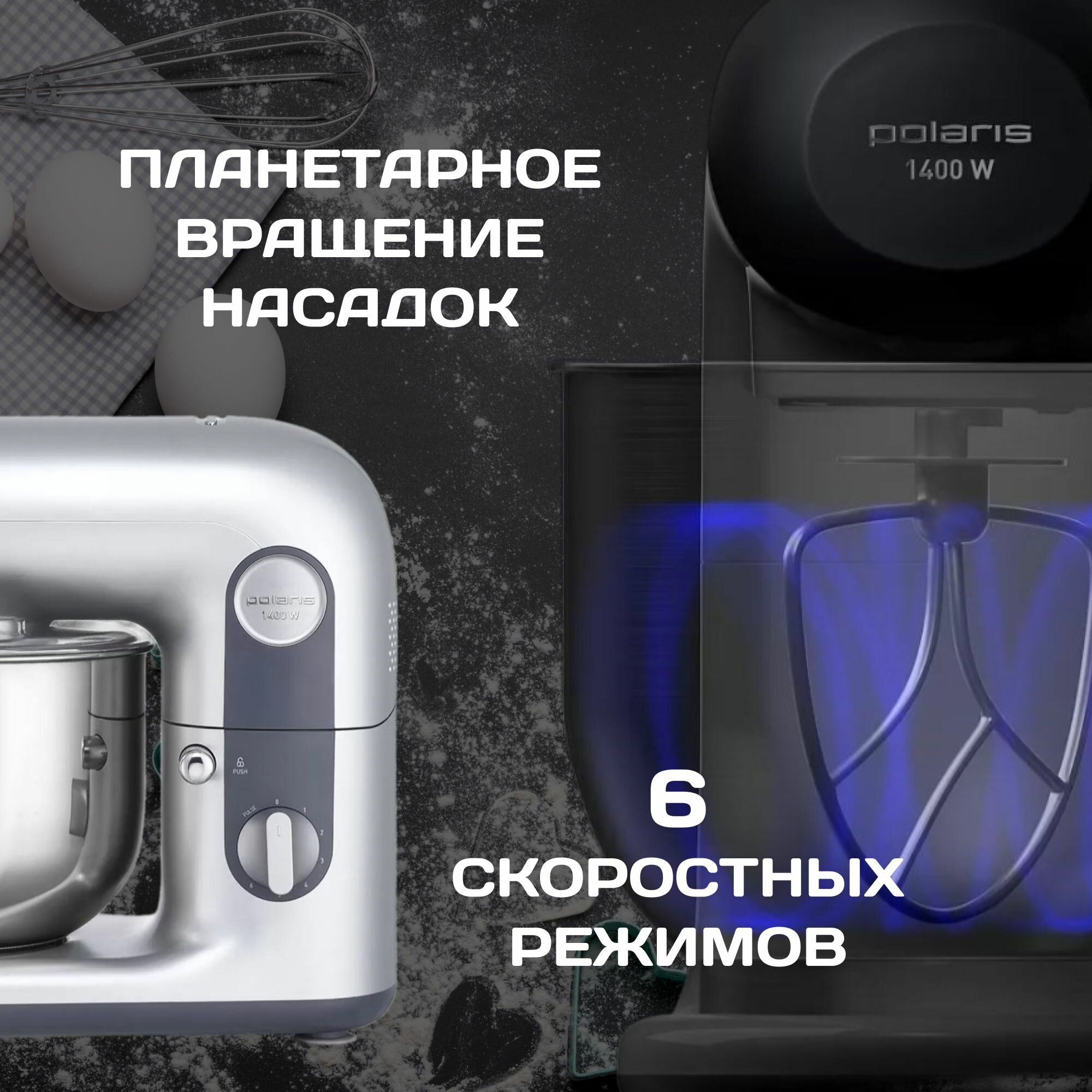 Планетарный миксер 3 в 1 Polaris PKM 1403, 6 скоростей, 1400 Вт