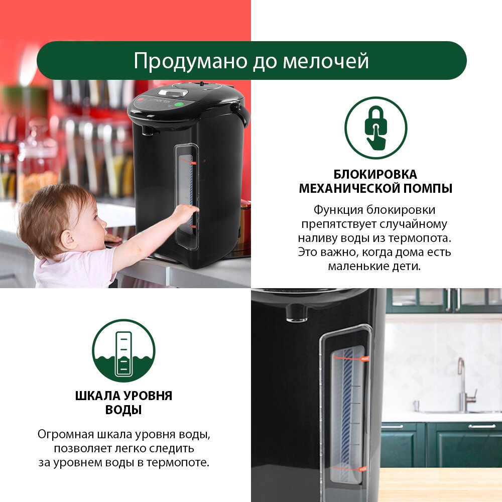| Отзыв: | Отличный вариант для офисов и маленьких магазинов. Дома хватит и обычного чайника этой-же фирмы. Термопот на 4,5 литра, вода закипает быстро и есть функция поддержания температуры. На корпусе есть прозрачное окно, через которое видно заполнение воды, без которой он не запустится, так как есть блокировка включения без воды. Есть ручка сверху корпуса для переноски. |