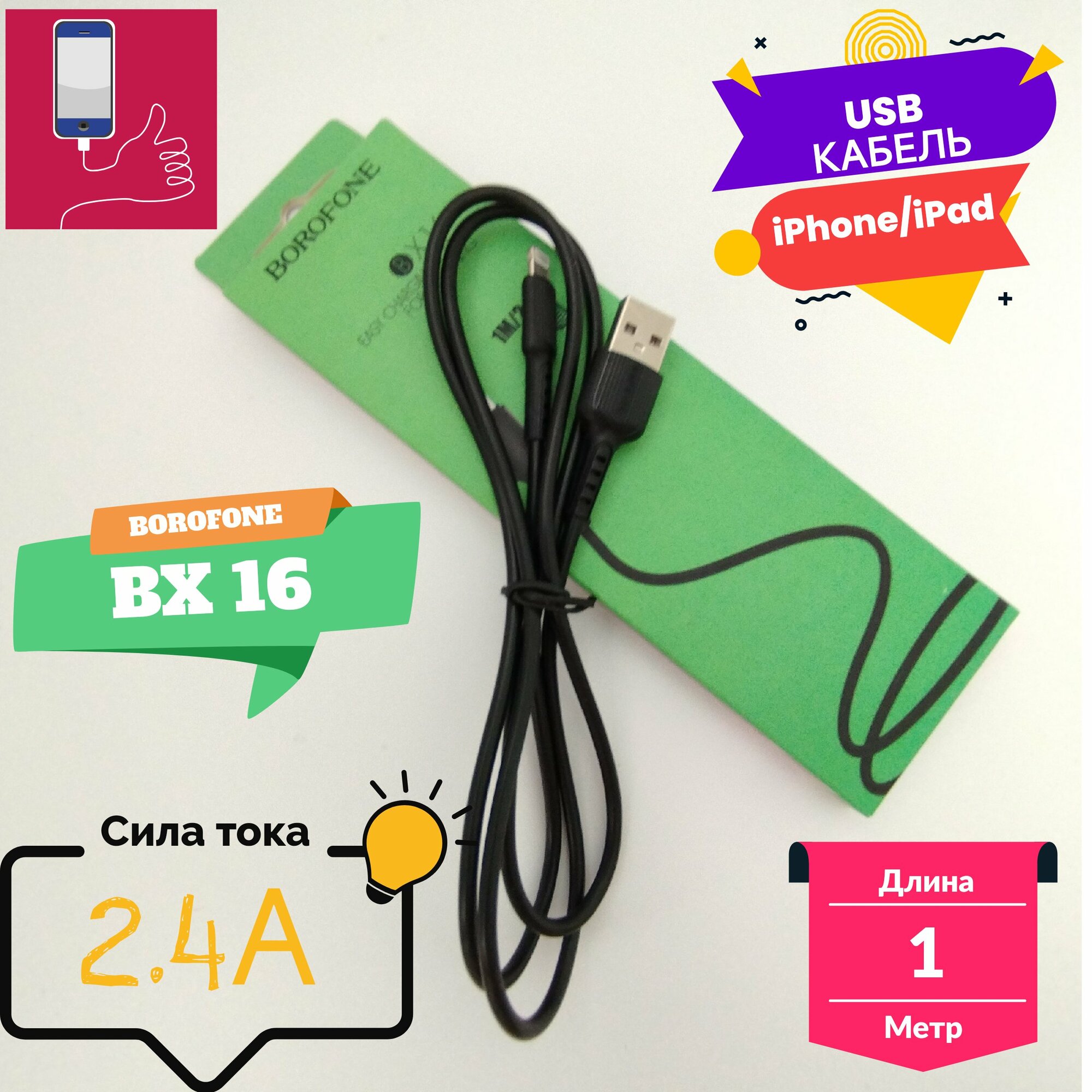 Кабель USB - iPhone Borofone BX16, 1м, черн