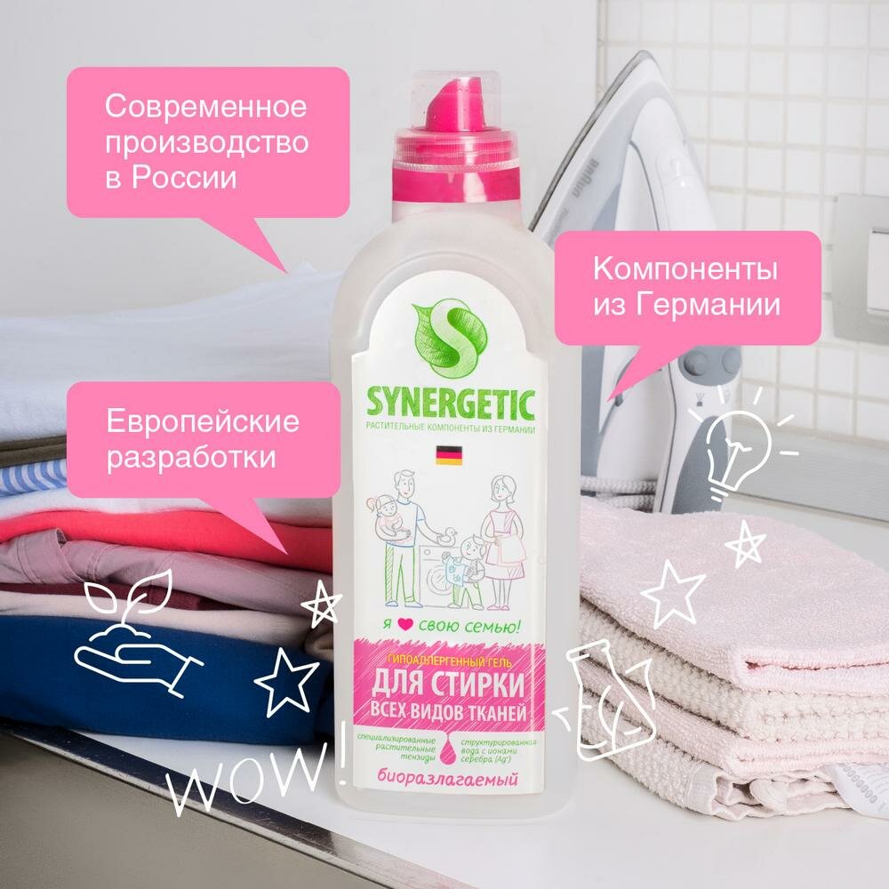 Гель для стирки Synergetic, универсальный, гиппоаллергенный, биоразлагаемый, 1л