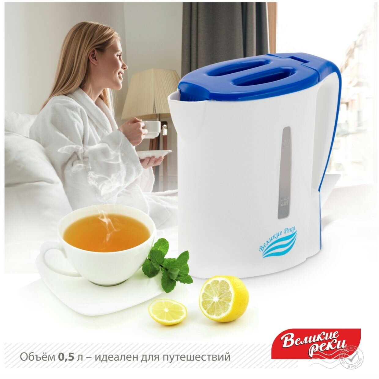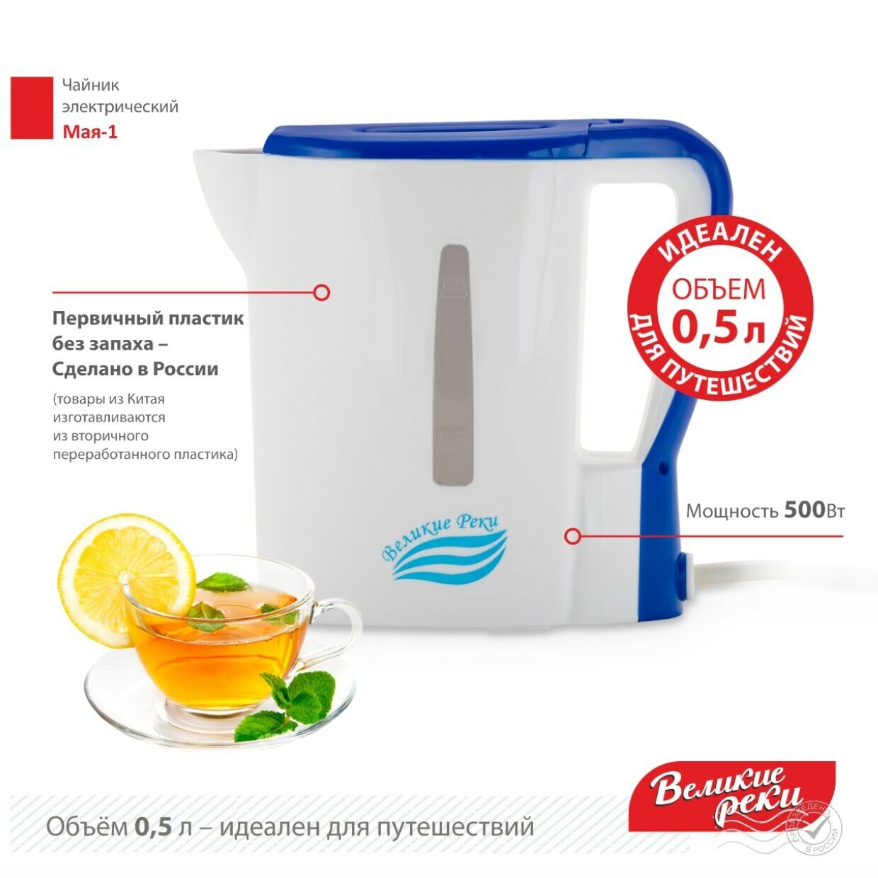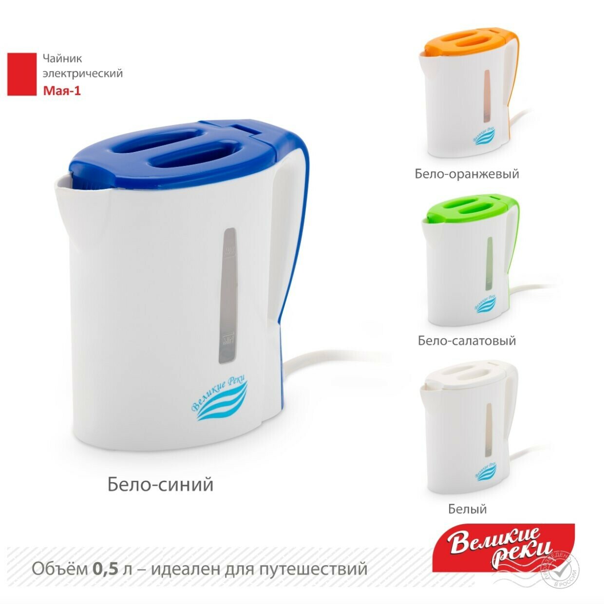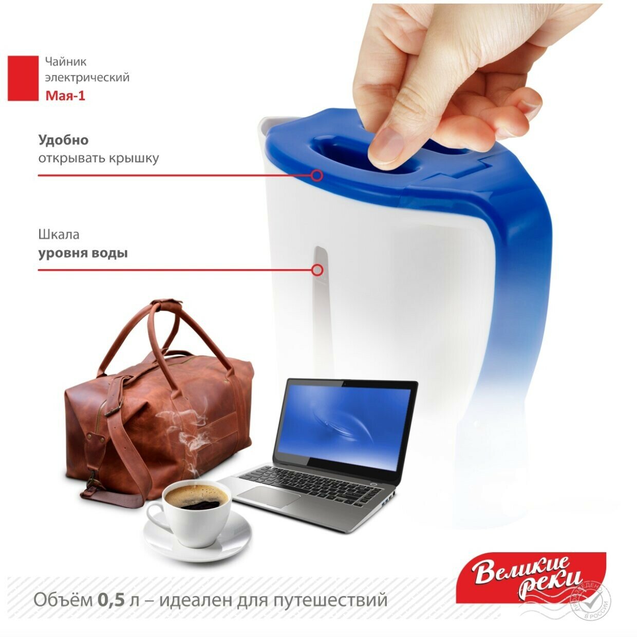 Купить Чайник электрический Великие Реки Мая-1 бело-синий, 0,5 л, пластик, 500 Вт
