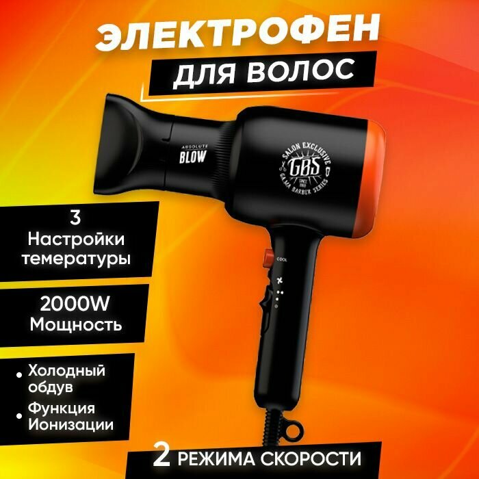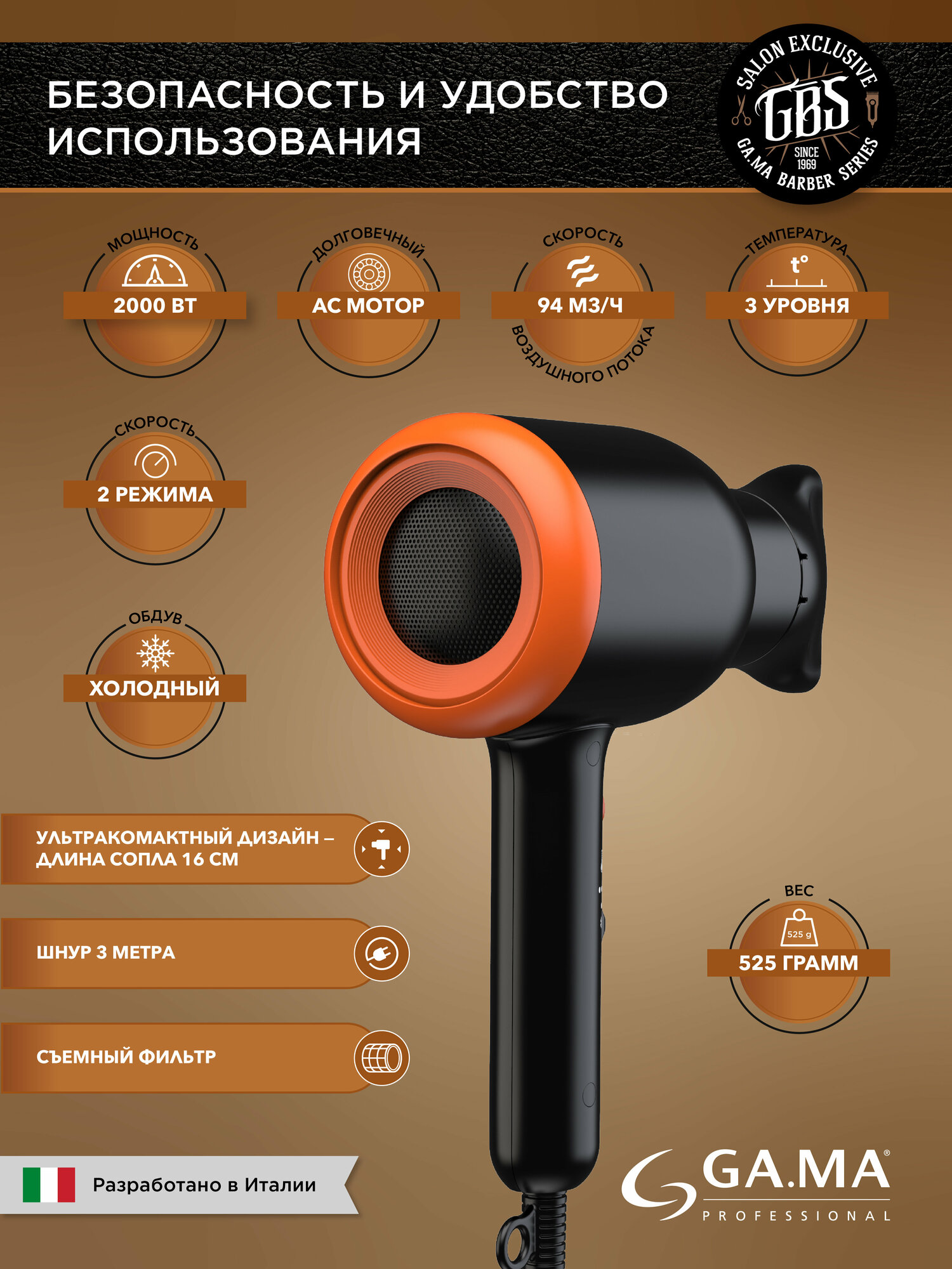 Фен GA.MA Absolute Blow GBS,Черный-оранжевый, компактный 525гр, 2000 Вт