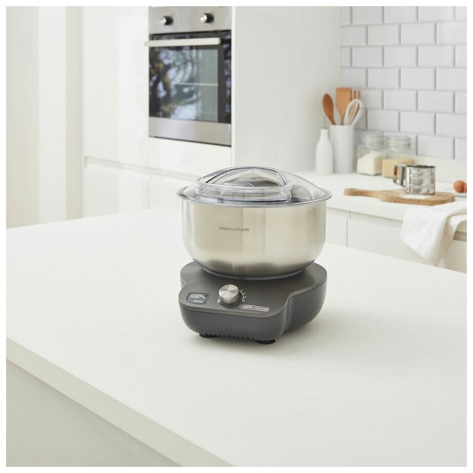 Миксер стационарный планетарный электрический Morphy Richards MixStar, 6 скоростей, 4л, 650 Вт, тестомесильная машина с чашей, хранение аксессуаров, защита от брызг, таймер, цвет серый