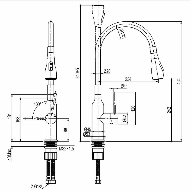 | Высота излива | 242 мм / 464 мм |