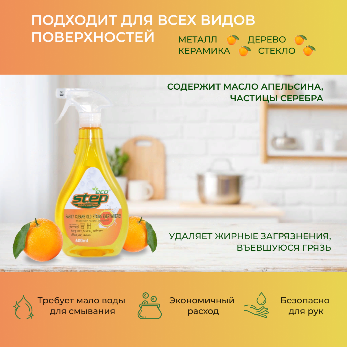Eco step универсальное жидкое чистящее средство для дома с апельсиновым маслом, 600 мл