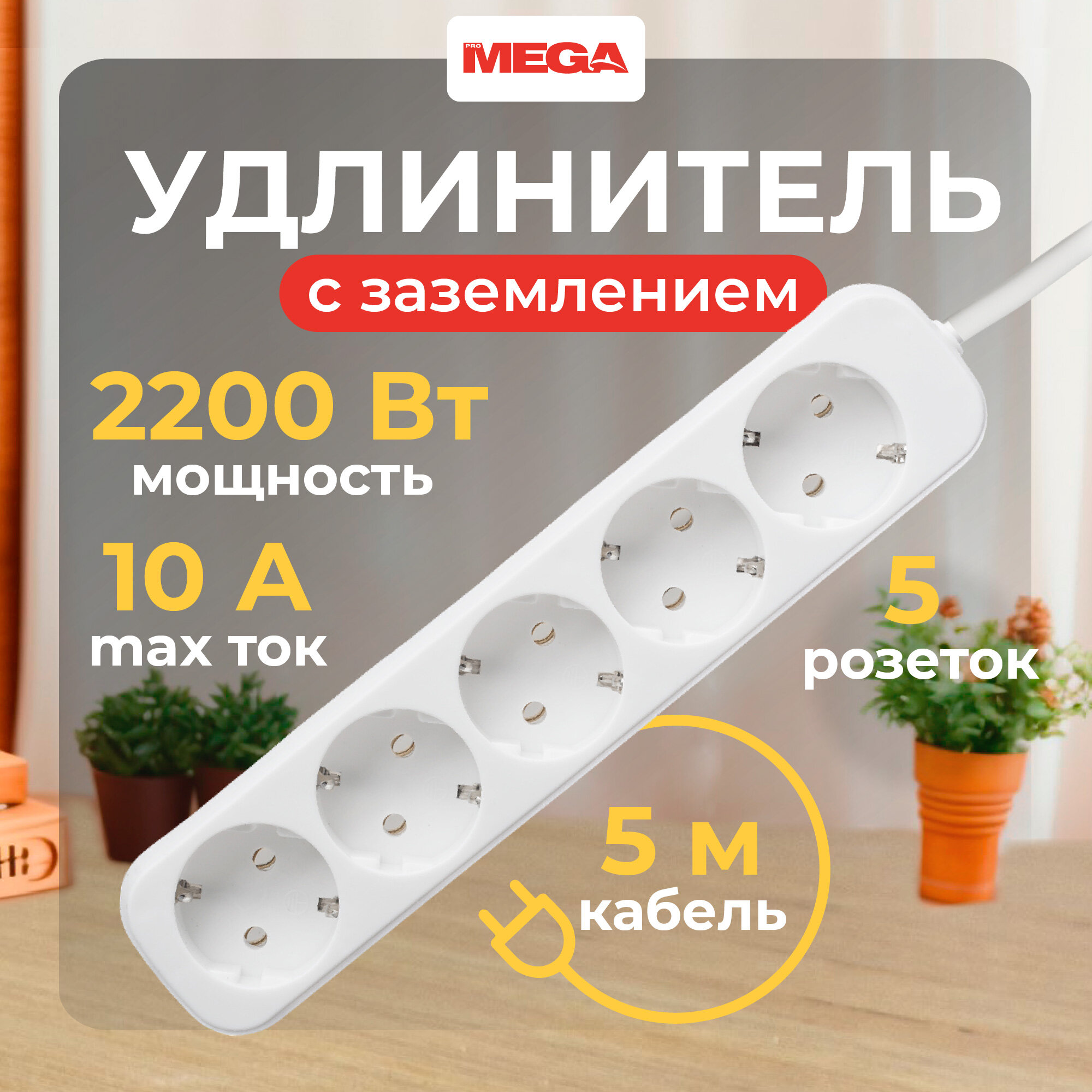 Удлинитель ProMega, сетевой фильтр, 2200 Вт / 10 А, 5 розеток, 5 метров