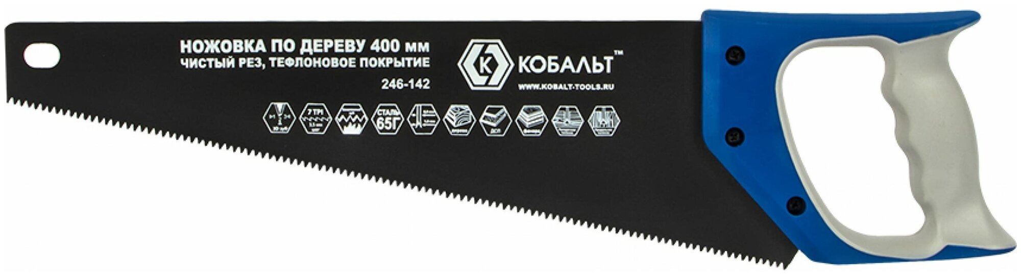 Ножовка по дереву кобальт 400 мм, шаг 3,5 мм/ 7 TPI, тефлоновое покрытиезакаленный зуб, 3D-заточка, двухкомпонентная рукоятка, чистый рез