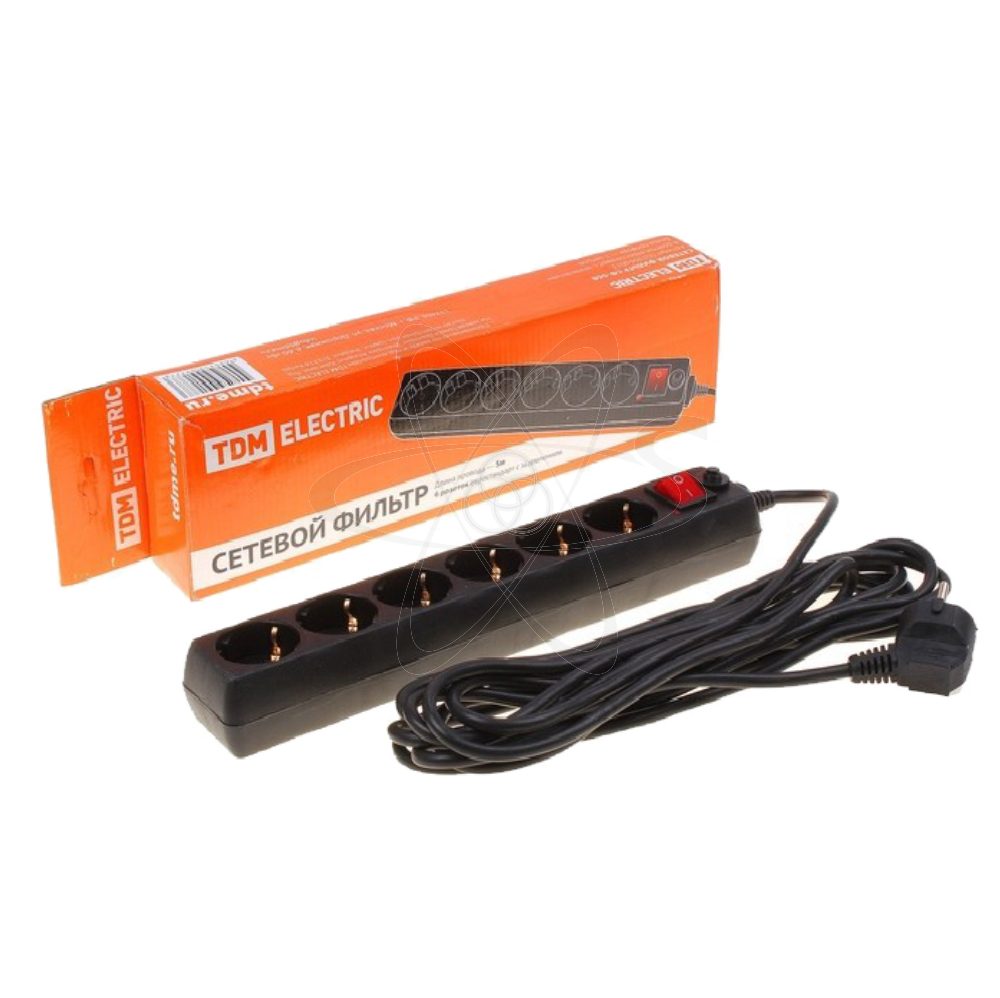 Купить Сетевой фильтр TDM СФ-06В, 6 гнезд, с заземлением и выключатель, ПВС 3x1, 1,5м