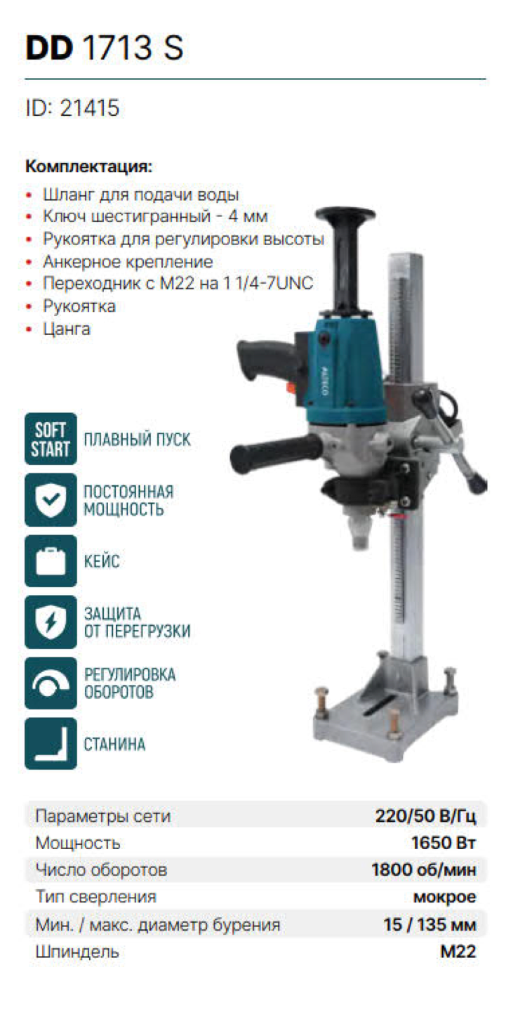Дрель алмазного бурения Alteco Professional DD 1713 S интересное: