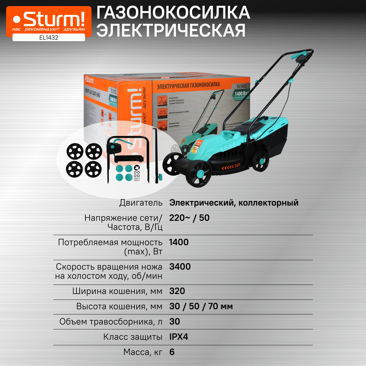 Газонокосилка электрическая Sturm EL1432, 1400 Вт, ширина 32 см, высота кошения 30-70 мм