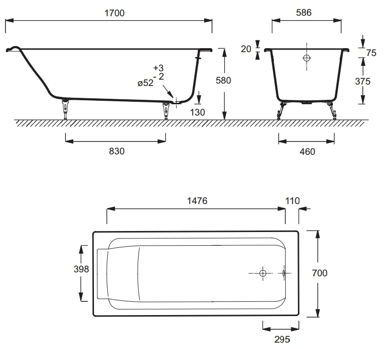 Чугунная ванна Jacob Delafon Parallel 170х70 E2947-S-00 без антискольжения, без отверстий для ручек