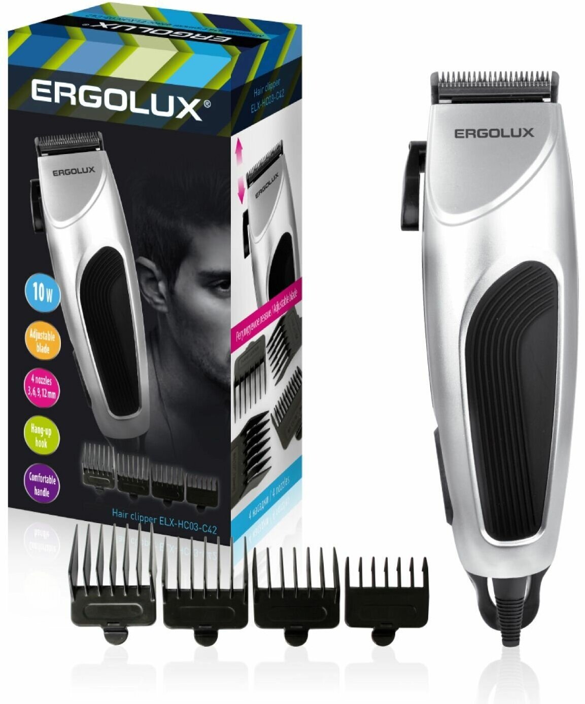 Машинка для стрижки Ergolux ELX-HCO3-C42, 10Вт, 4 насадки, серебристый