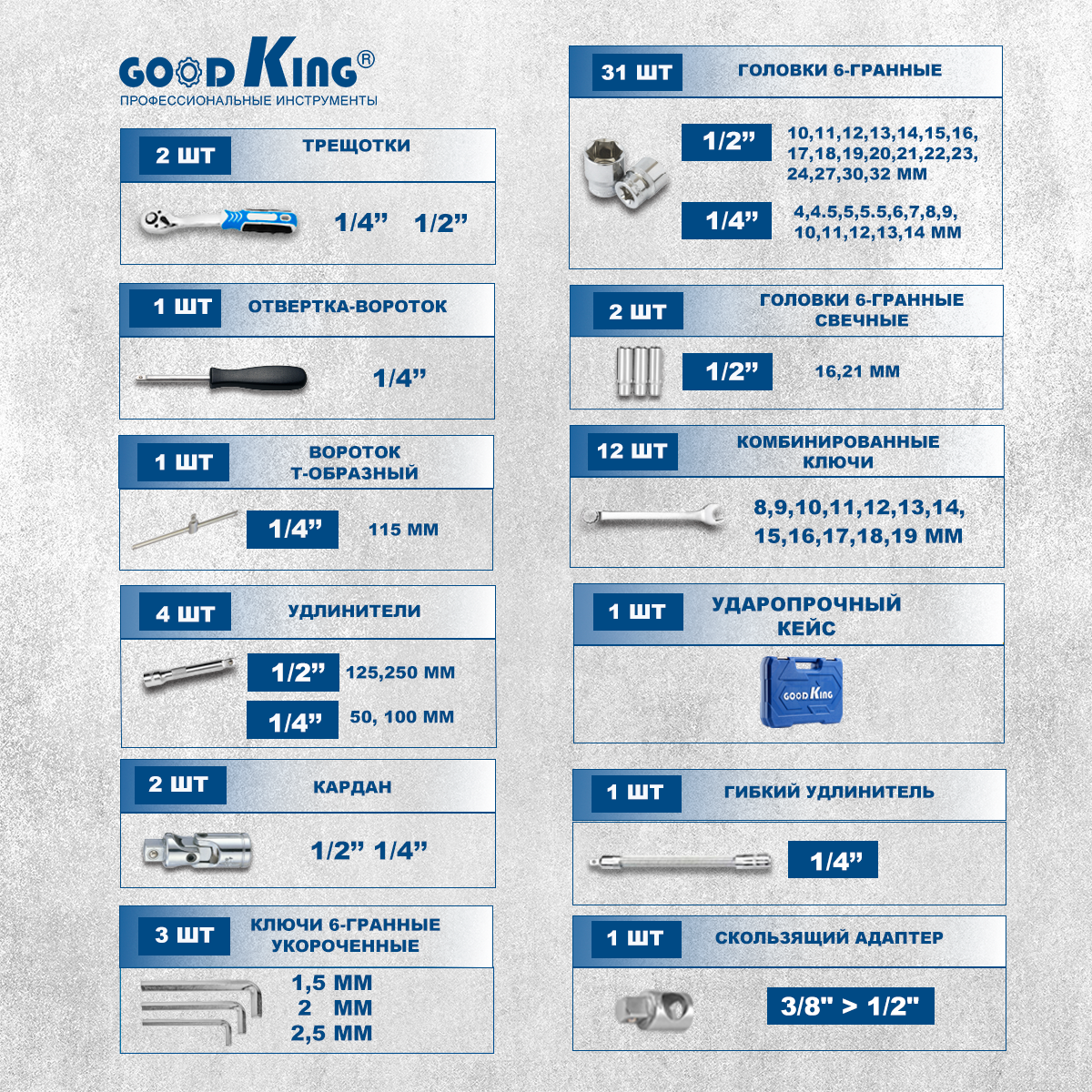 Набор автомобильный Good King 61предмет, действительно, профессиональной инструмент,кейс очень прочный,с хорошего материала сделан, металлические зазтежки.