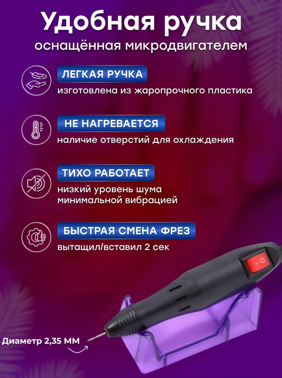 | Минусы: | Может мне попался бракованный, судя по положительным отзывам, но мой аппарат просто ужасный. Амплитуда вибрации фрезы пол сантиметра, сама ручка вибрирует так что рука до локтя трясётся. сделать маникюр просто невозможно, в мусорное ведро к сожалению |