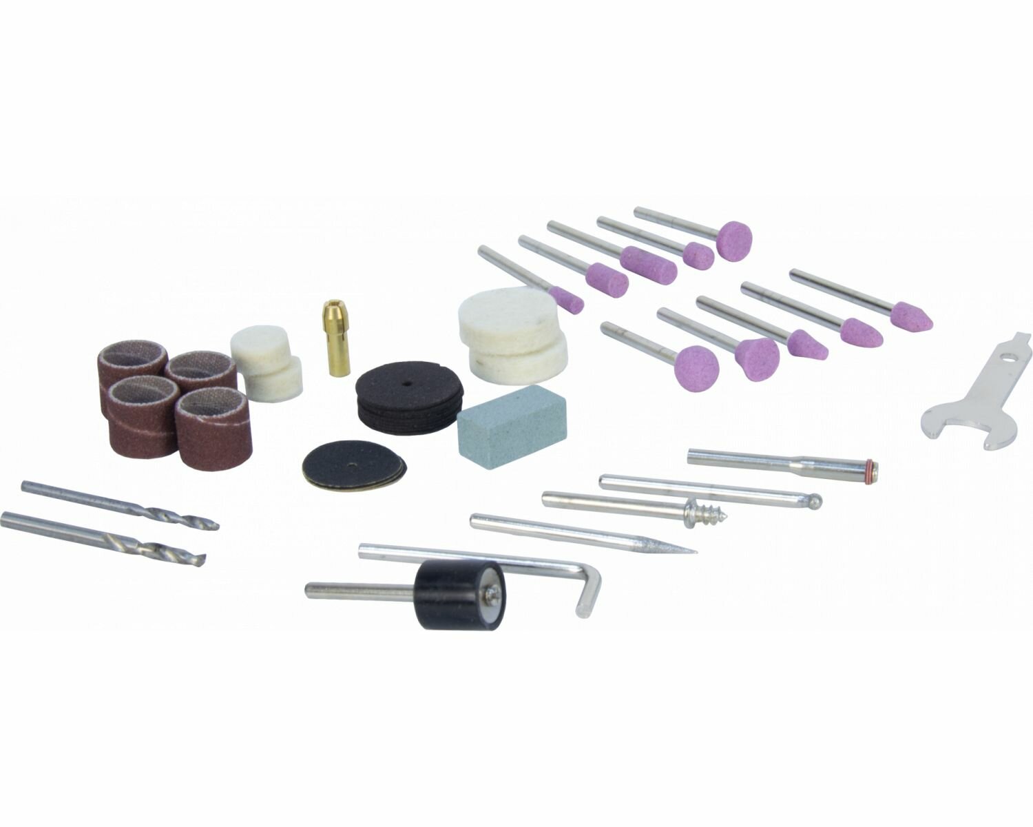 | Комплектация | документация, кейс, гибкий вал, шлифовальные круги с наждачной бумагой - 10 шт, шлифовальная наждачная бумага 3,2 мм, шлифовальная лента, сверла 2,3 мм/3,2 мм - 2 шт, алмазная бита - 2 шт, насадка барабан 3,2 мм - 2 шт, войлочный круг - 4 шт, точильный камень, коронка 2,3 мм/3,2 мм - 2 шт, отрезной круг - 8 шт, наждачная бумага - 3 шт, ключ |