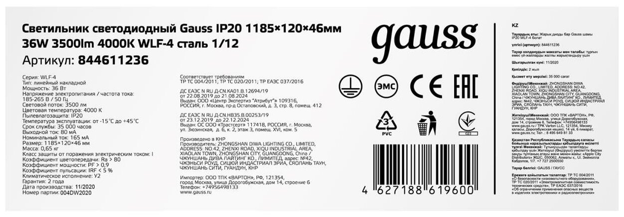 Купить Линейный светильник GAUSS WLF-4 36W 3500lm 4000K 185-265V IP20 1185х120х46мм сталь LED 1/12 844611236