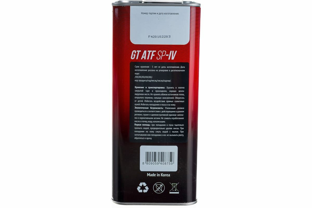 Масло Трансмиссионное Gt Oil Atf Sp Iv 4 Л 8809059408759 GT OIL арт. 8809059408759