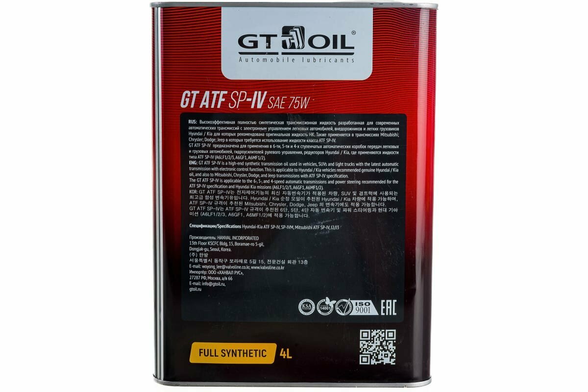 Масло трансмиссионное gt oil 4л синтетика gt atf sp iv, gt oil, 8809059408759