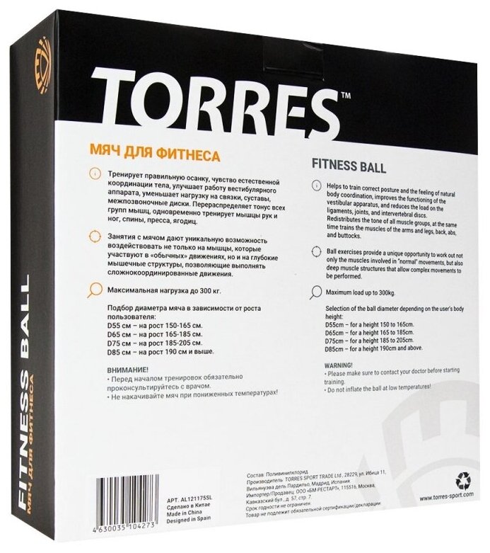 Мяч гимнастический TORRES , арт.AL121175BL, диам. 75 см, эласт. ПВХ, с защ.от взрыва,с насосом, голубой интересное: