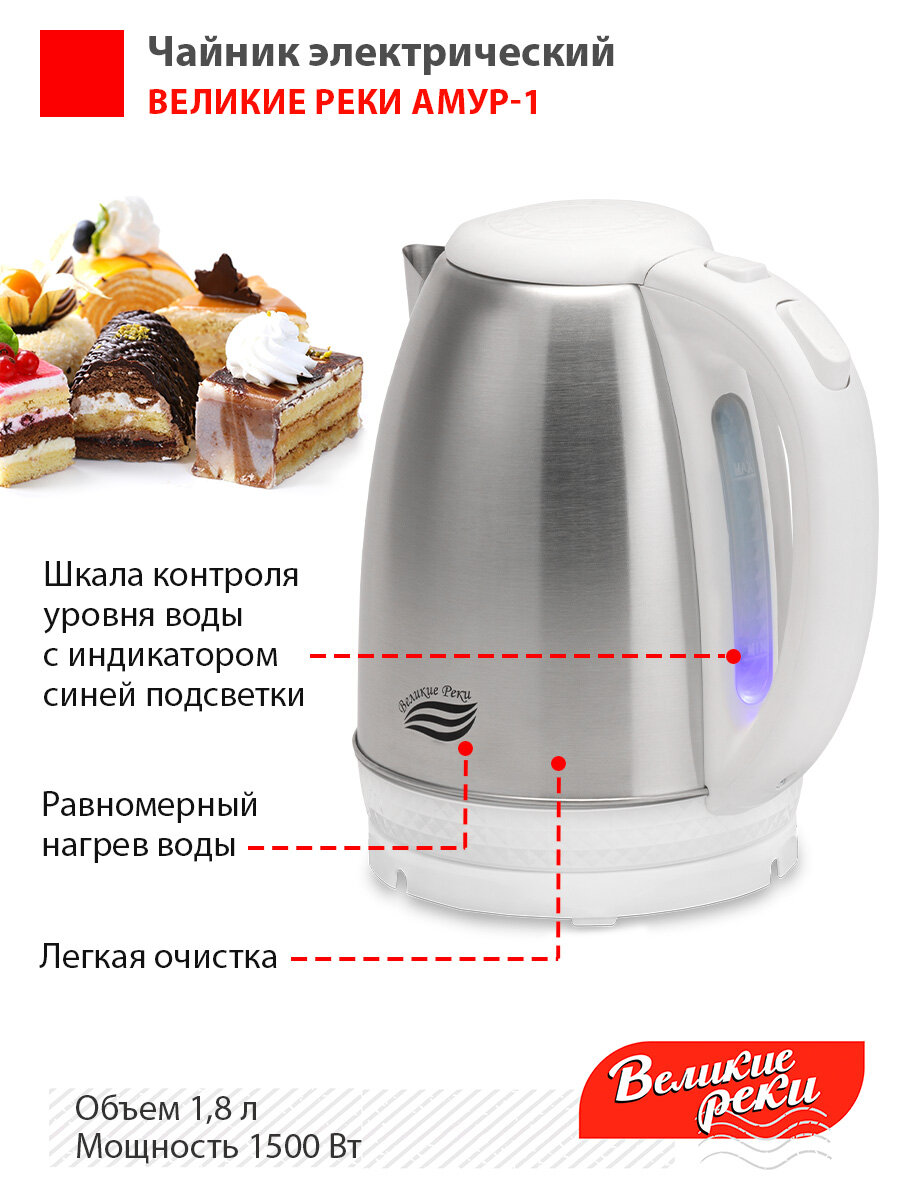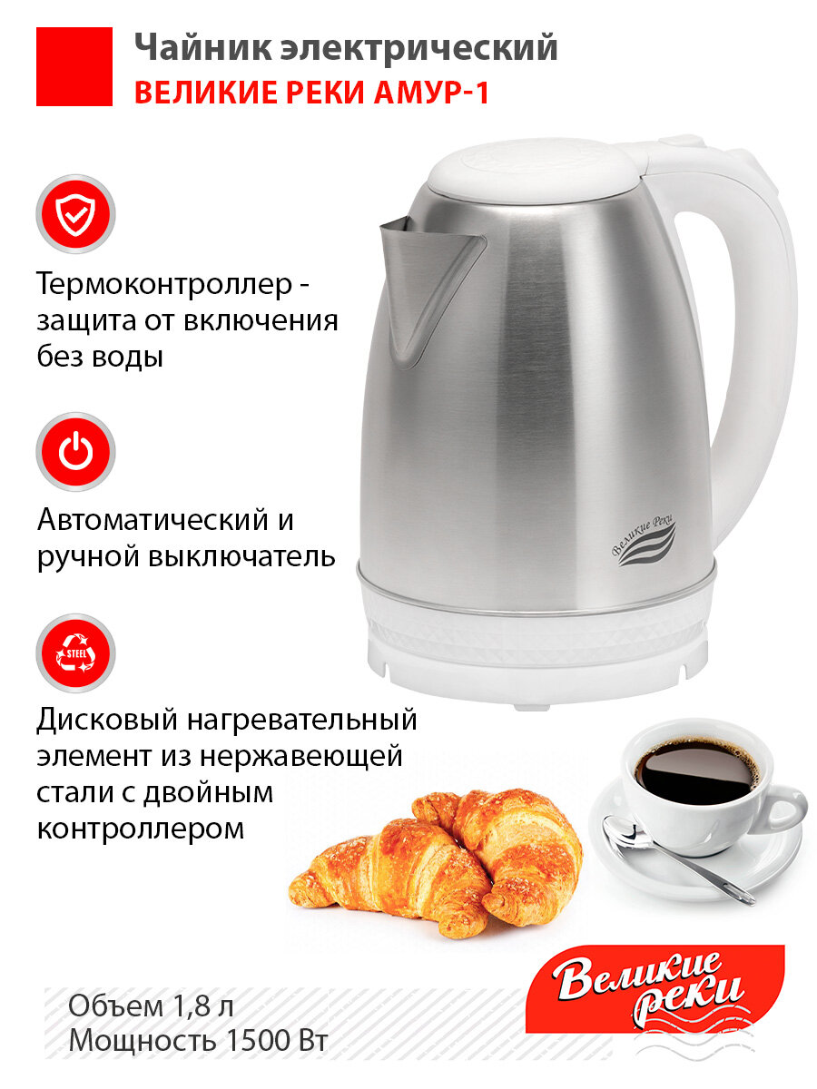 Чайник электрический Великие реки Амур-1 белый, 1,8л, нержавейка