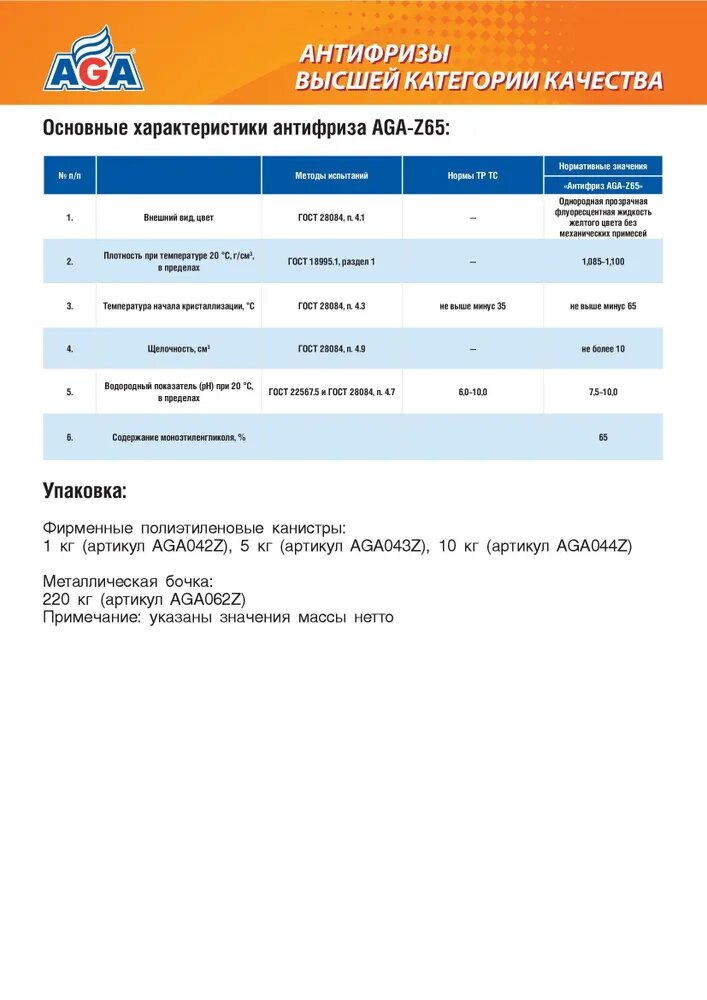 Антифриз-готовый Aga Z65 жёлтый, -65С, 1 кг, 042Z