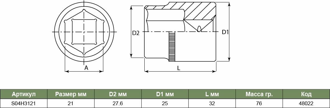 S04H3121 Головка торцевая 3/8"DR, 21 мм