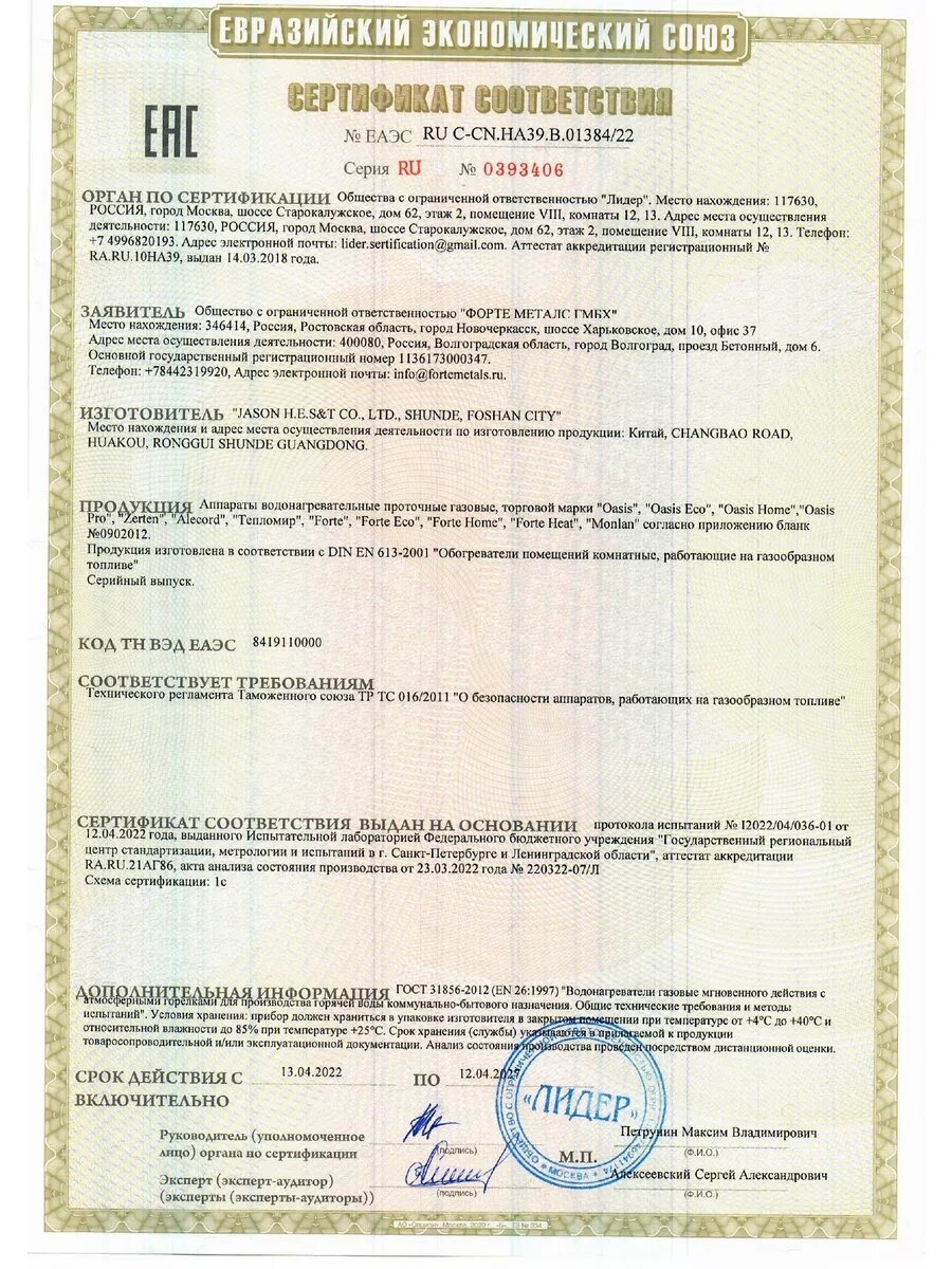 Водонагреватель газовый Oasis Eco (Zerten), проточный серия Glass K-20 кВт