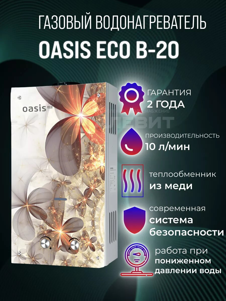Газовая колонка Oasis Eco Glass B-20 Каменный цветок, 20 кВт, 10 л в м. Энергонезависимая Работа при пониженном давлении воды Электронное зажигание Сетчатый фильтр КПД 90% LCD дисплей