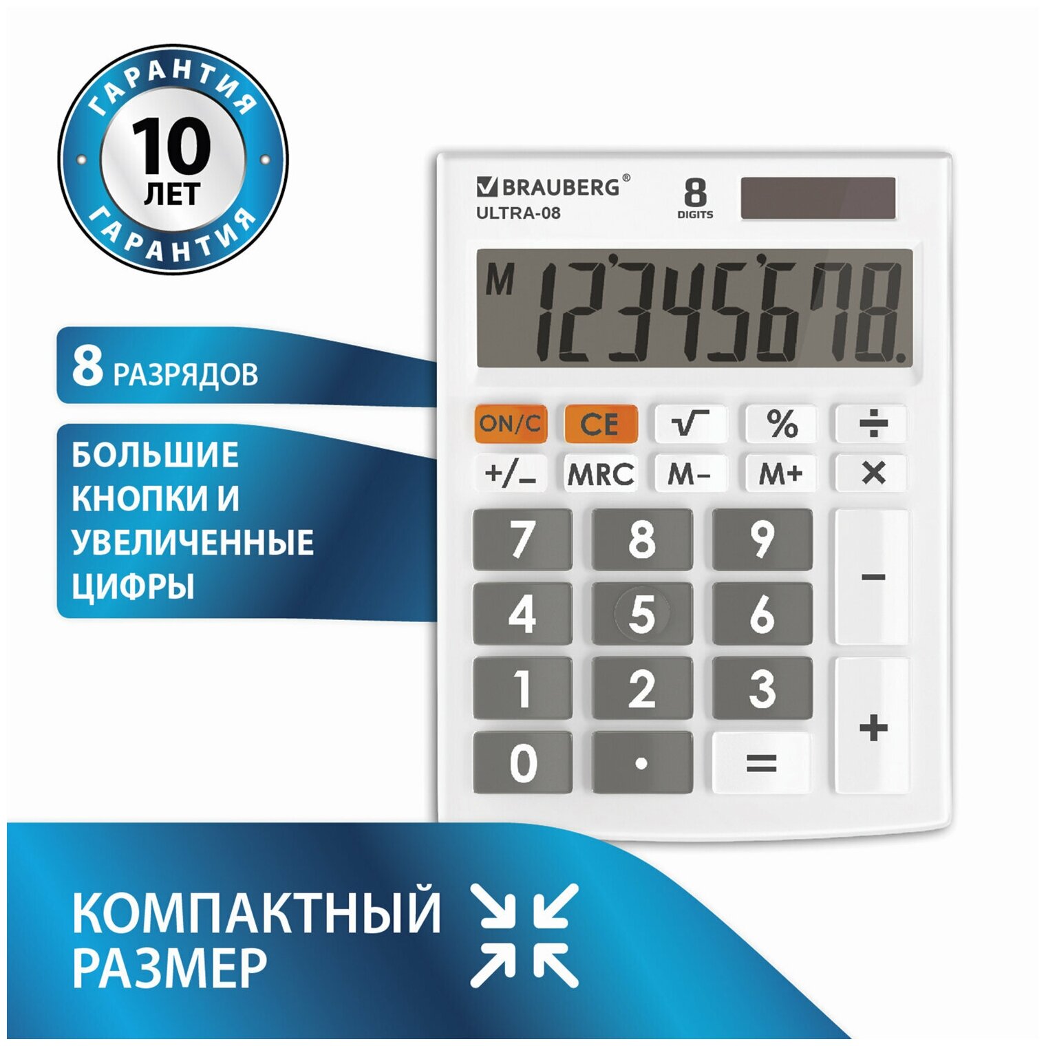 Калькулятор настольный BRAUBERG ULTRA-08-BU, компактный (154x115мм), 8 разрядов, синий, 250508