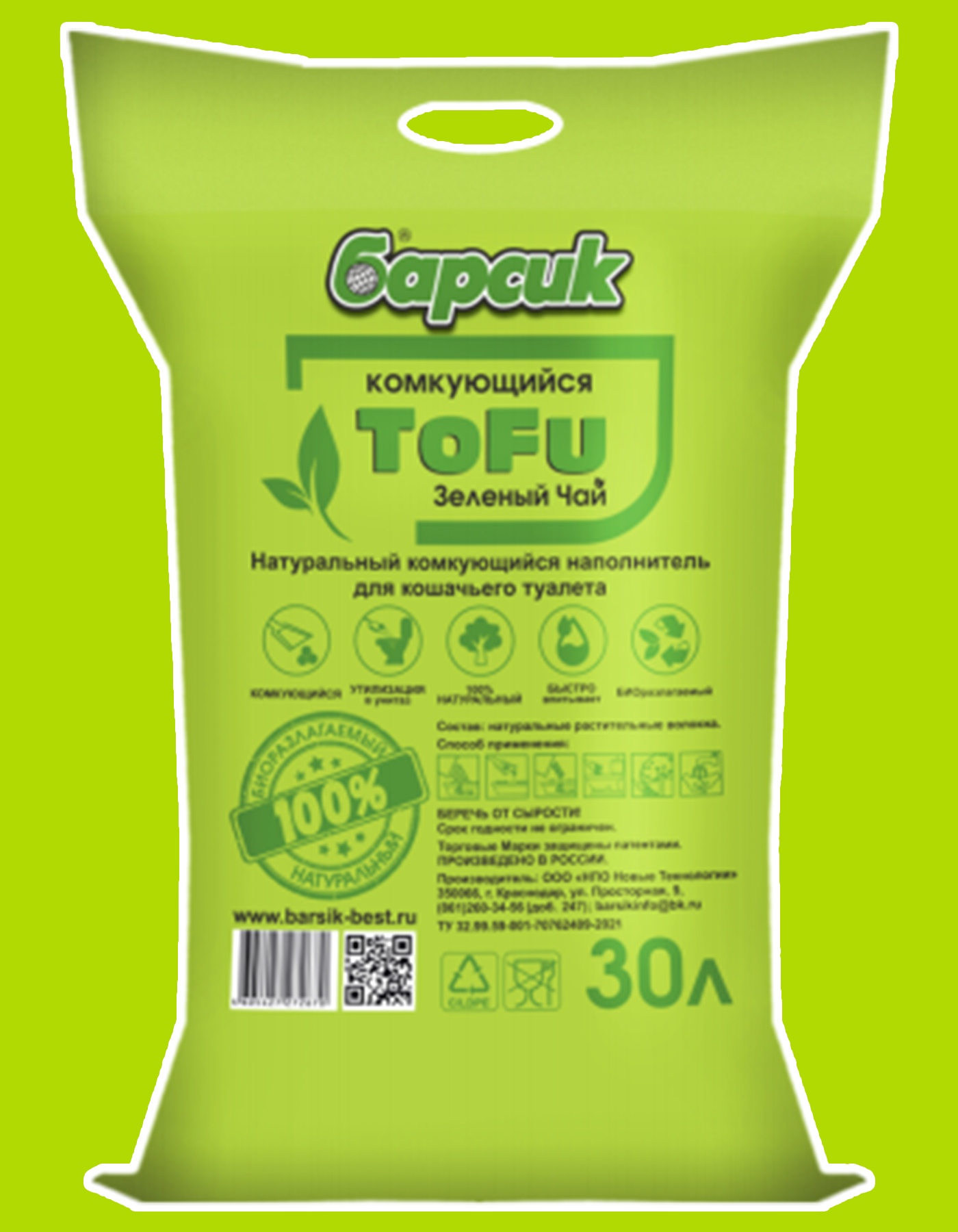 Наполнитель Барсик TOFU комкующийся с ароматом зелёного чая 30 л (16,3 кг).