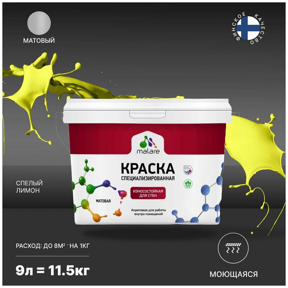 Купить Краска Malare Professional интерьерная износостойкая для стен и обоев, моющаяся, потолка, акриловая, быстросохнущая, матовая, cпелый лимон, (9л - 11.5кг).
