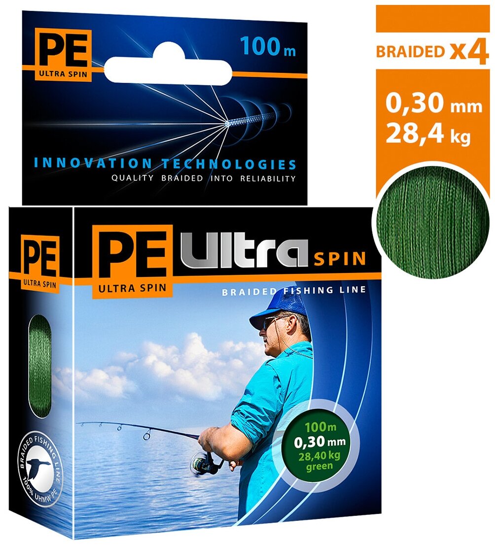Плетеный шнур для рыбалки AQUA PE ULTRA SPIN Dark Green 0,30mm 100m, цвет - темно-зеленый, test - 28,40kg
