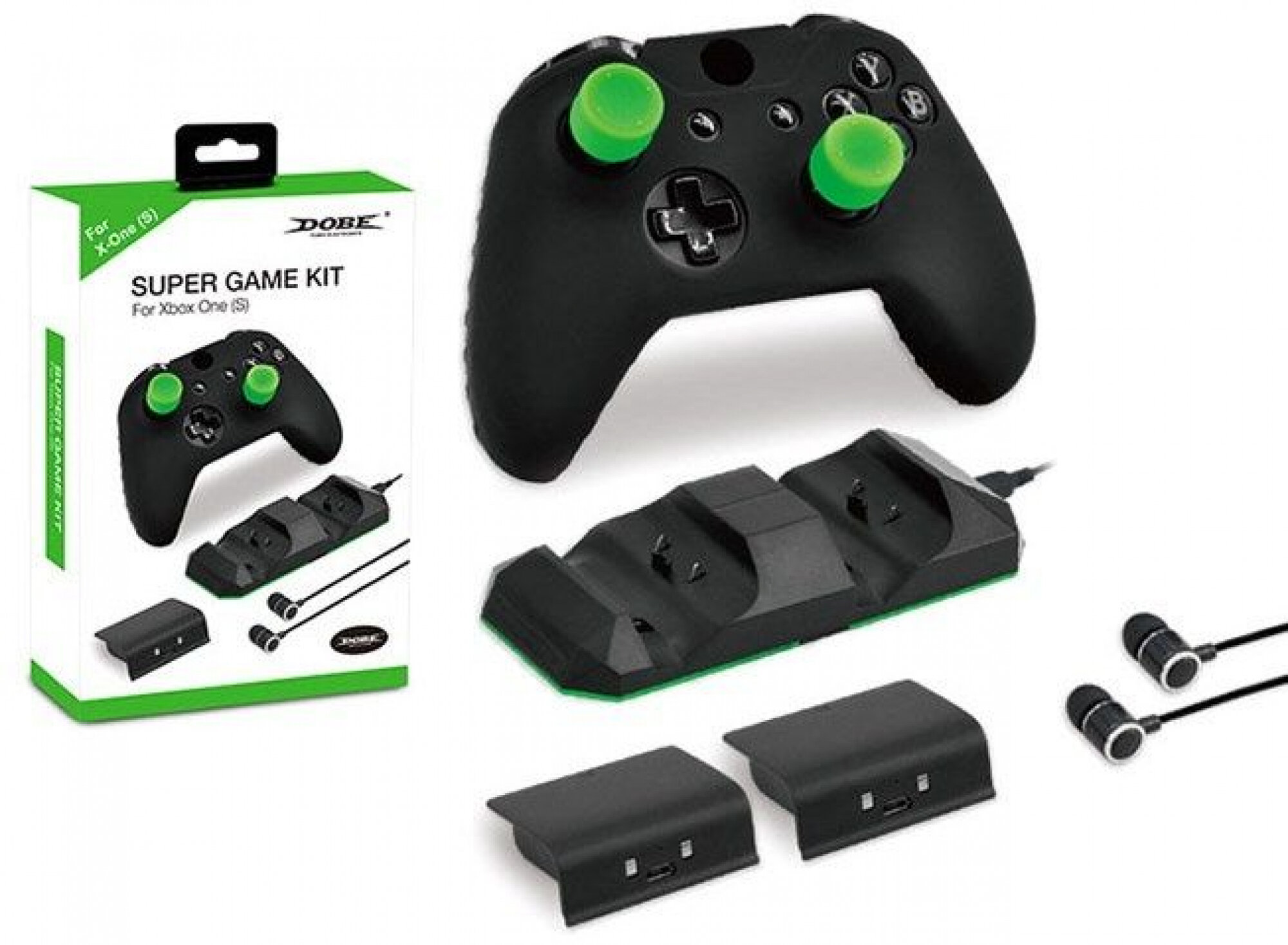 Зарядная станция с 2 аккумуляторами + силиконовый чехол и 4 накладки на стики + наушники + для джойстика XBOX One S / X Super Game Kit DOBE TYX-1752, черная