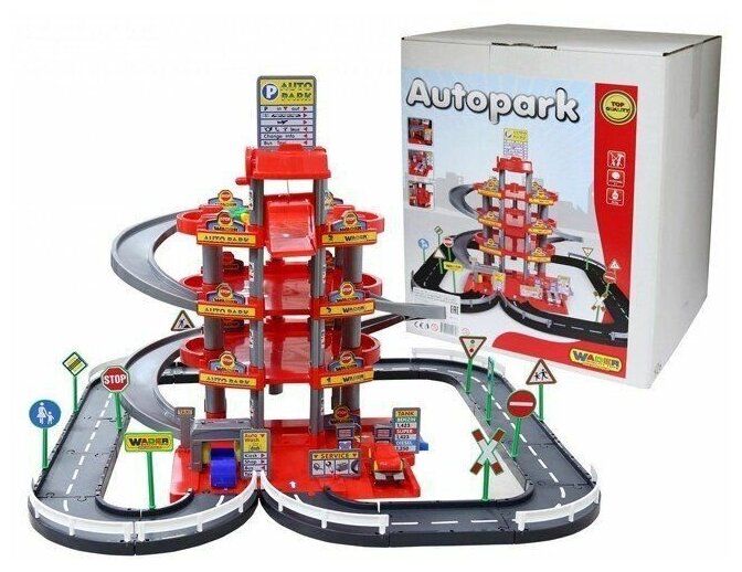 Паркинг 4-уровневый с дорогой и автомобилями, красный (в коробке)
