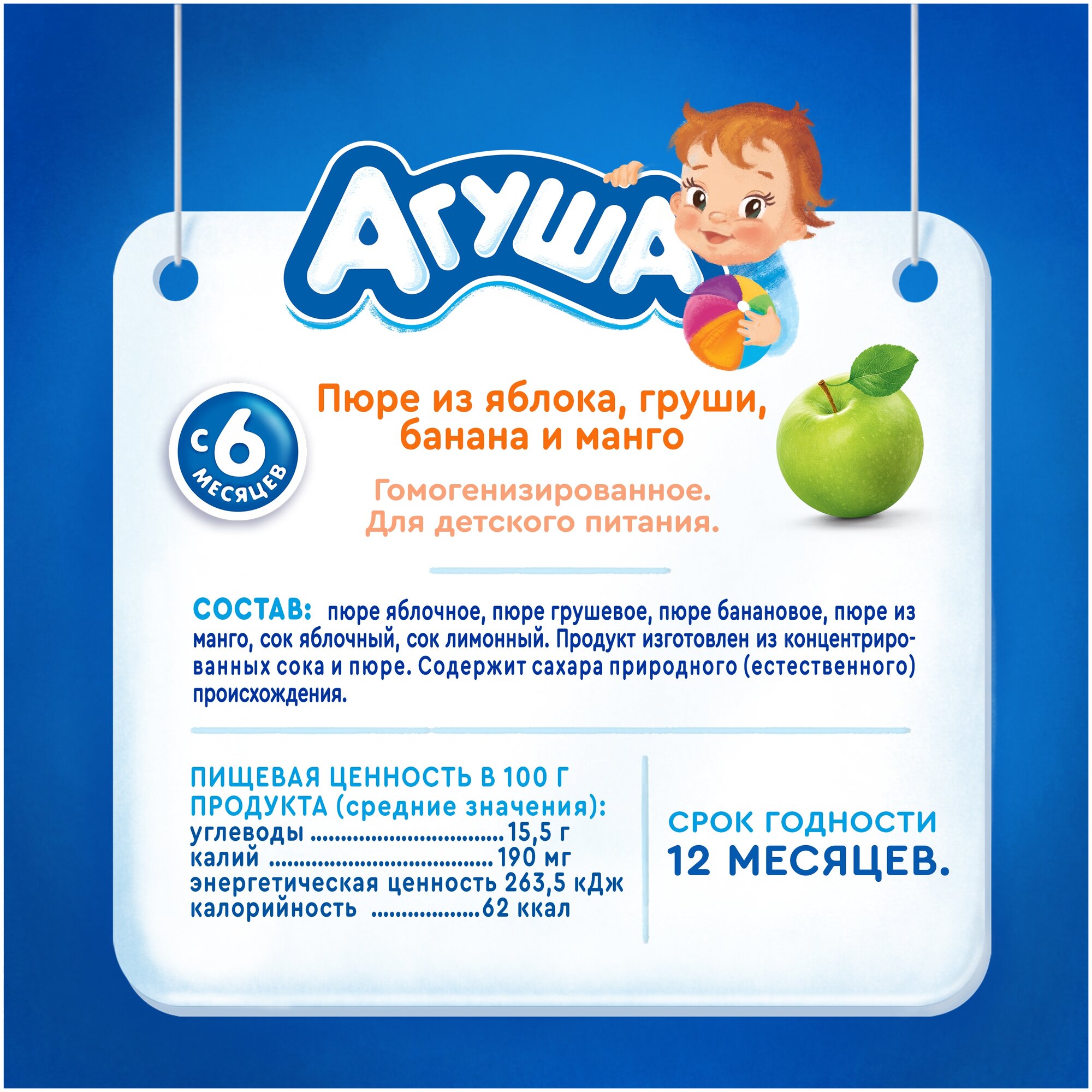 Пюре Агуша Яблоко-груша-банан-манго, с 6 месяцев, 90 г, 10 шт.