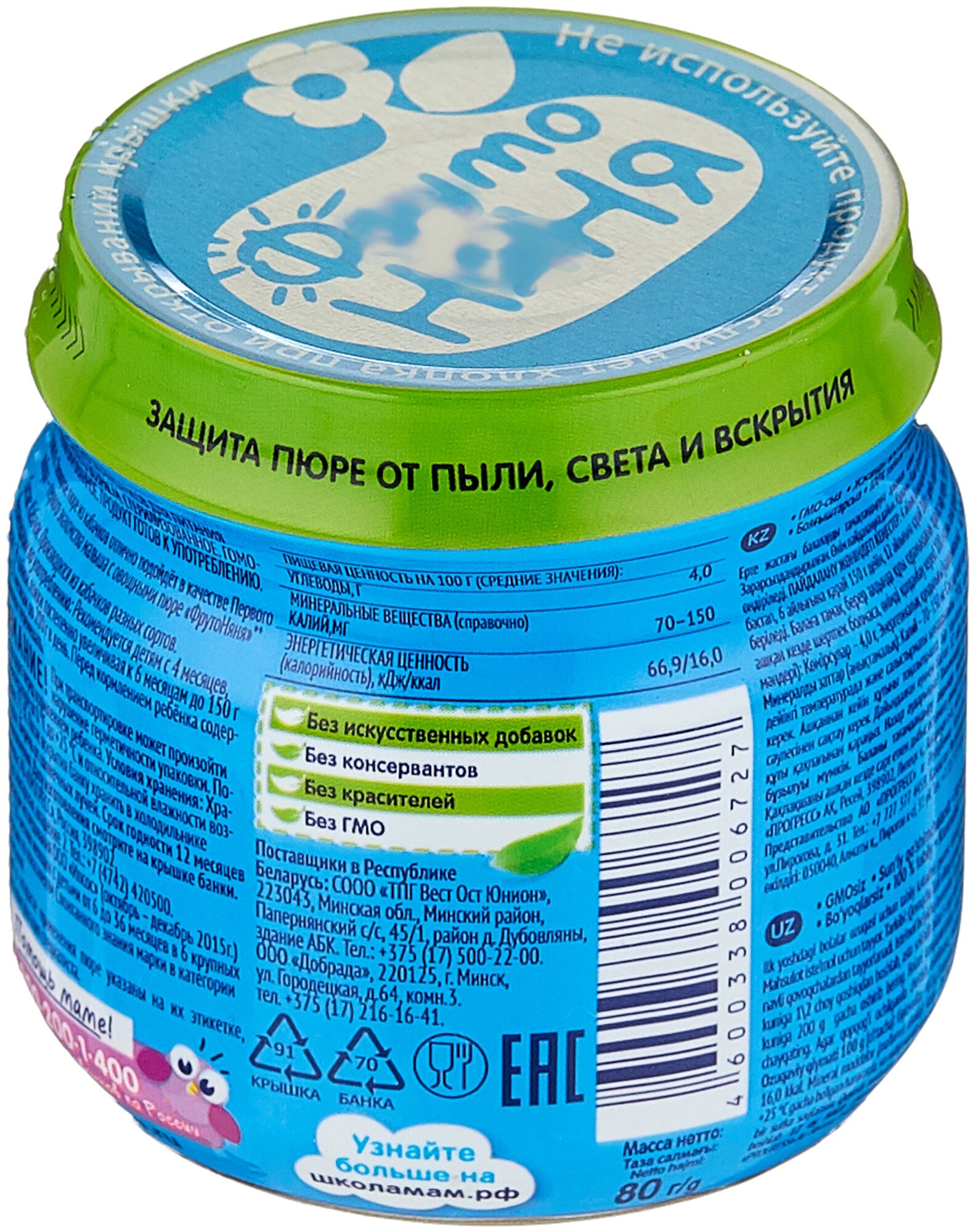 Вкус очень приятный,не горчит,не кислит, присутствует природная сладость. Консистенция гомогенная,что очень важно, чтобы ребенок не подовился. Состав без ГМО, красителей,соли и сахара,что так же не мало важно. Ребенку нравится, кушает с удовольствием. Так же радует наличие мерной полоски, чтобы отмерять нужное количество пюре. Срок годности после вскрытия в холодильнике 24 часа,что позволяет использовать продукт на 2 дня. |