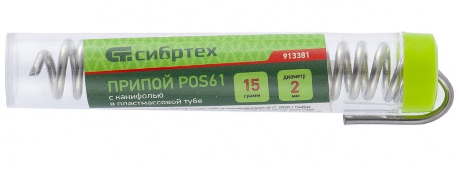 Припой с канифолью СИБРТЕХ 913381, D 2 мм, 15 г, POS61, в пластмассовой тубе
