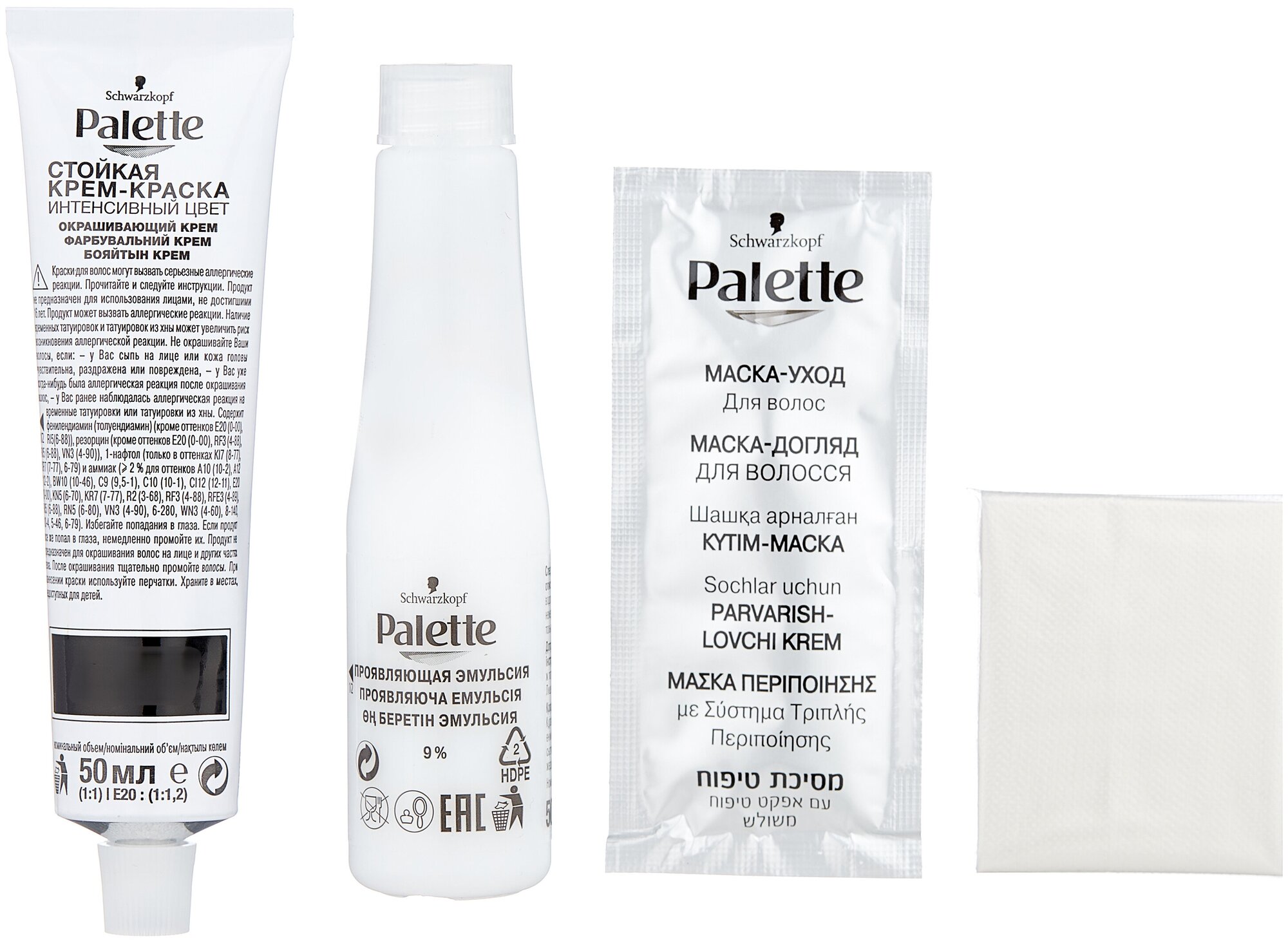 | Отзыв: | В состав краски входит тюбик с самой крем-краской, проявляющая эмульсия, перчатки, маска для ухода за волосами после окрашивания и инструкция.