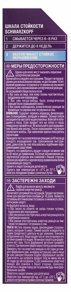 | Дополнительная информация | краски для волос могу вызывать серьезные аллергические реакции; проведите тест на аллергическую реакцию; продукт не предназначен для лиц младше 16 лет; содержит перекись водорода; избегать попадания в глаза |
